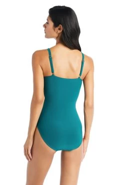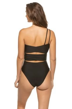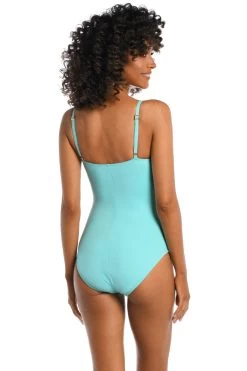 Alex one piece swimsuit features a high cross wrap neckline with an added tie feature around the waist. Offers an open front and back with minimal coverage. Does not come with removable padding.