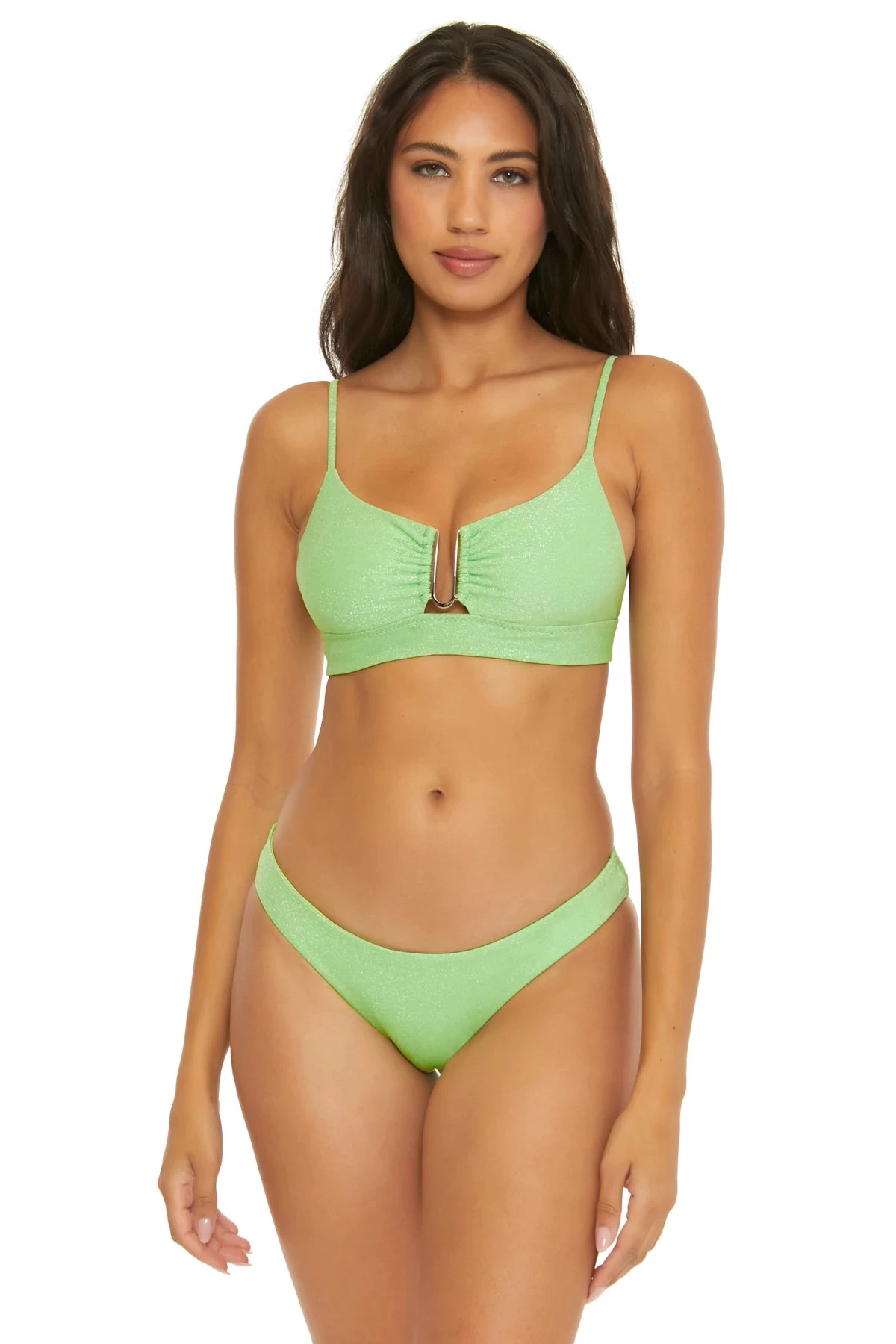 Amira bikini top features a metallic texture with a metal U-shaped detail. Offers removable soft cups, adjustable straps and an adjustable back tie closure.