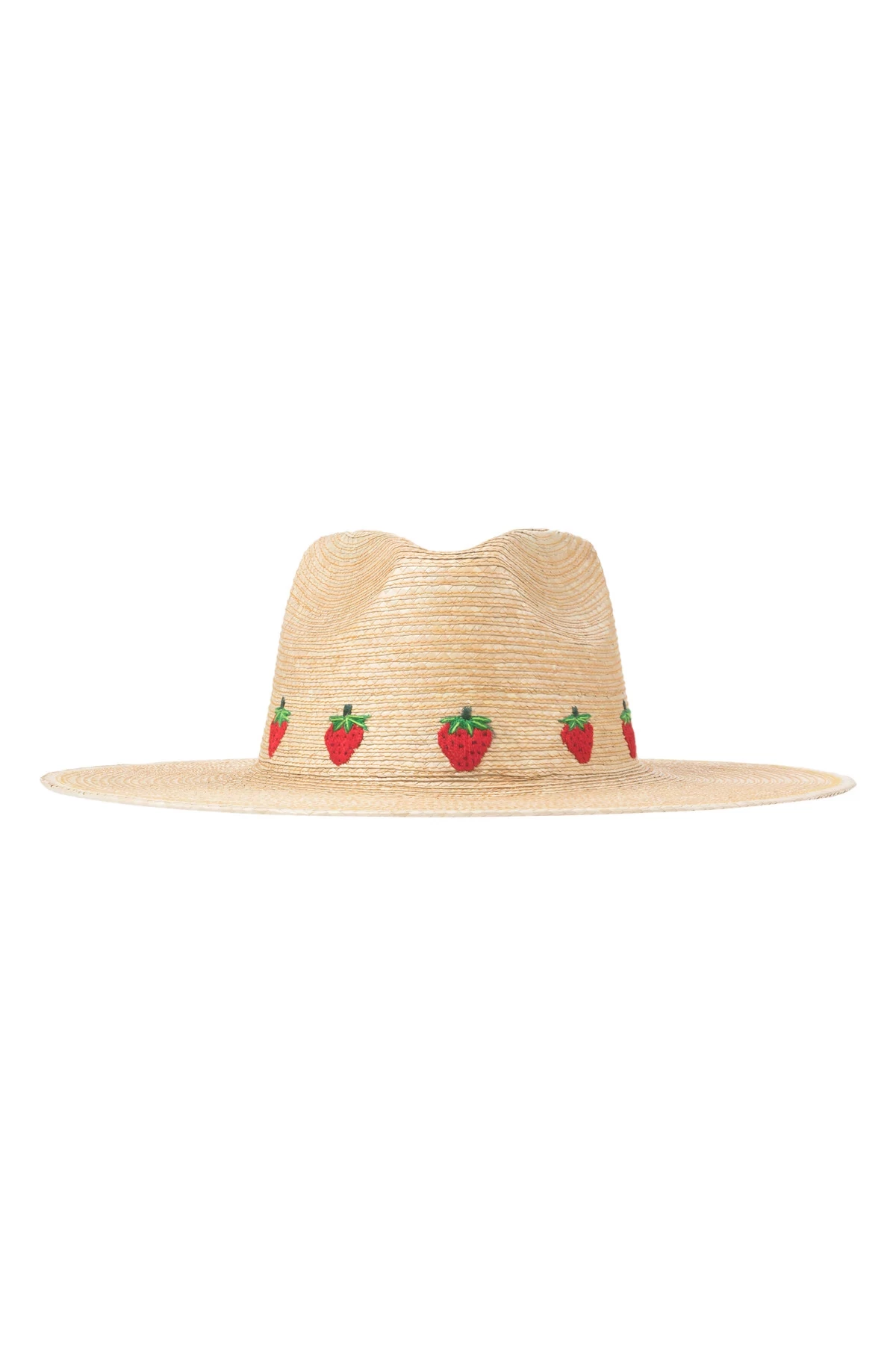 Belinda panama hat features embroidered strawberry accents and is both sustainable and a fair trade partnership.