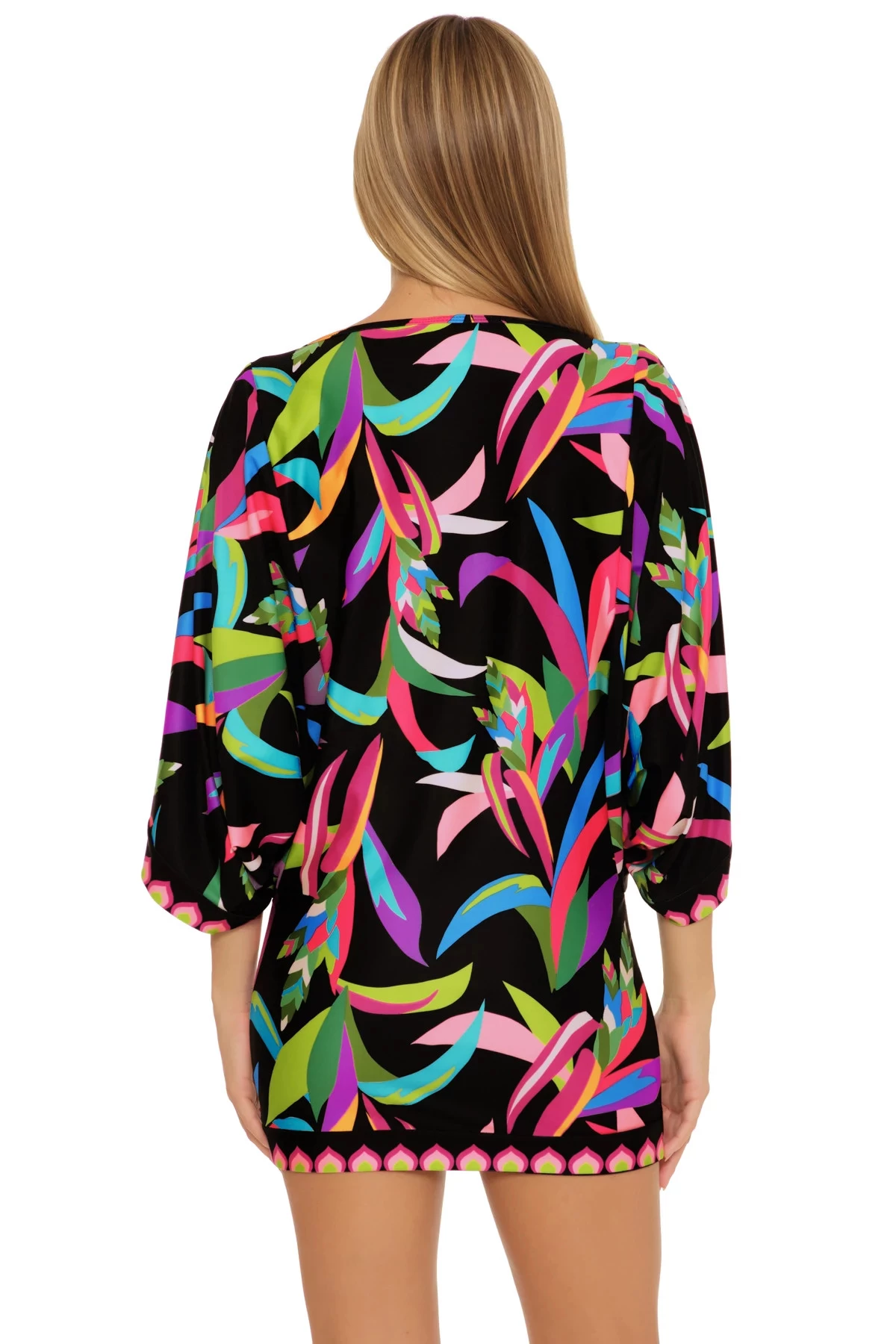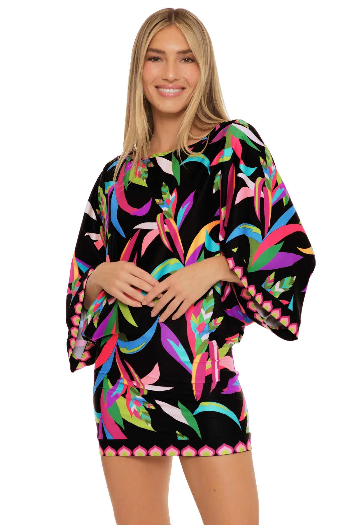 Tunic dress features a birds of paradise print with butterfly sleeves and a fitted silhouette.