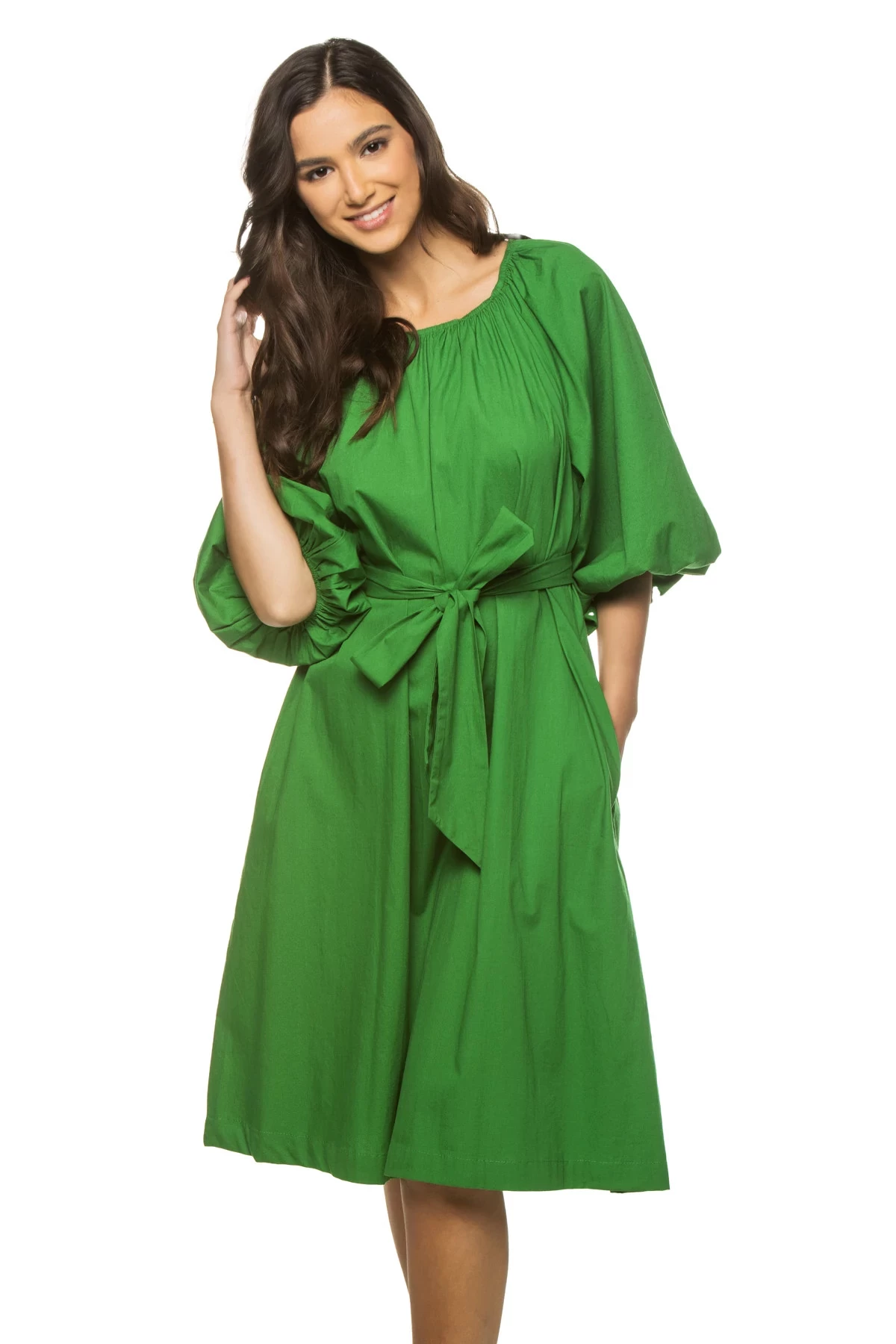 Bliss midi dress features balloon sleeves, elastic wrists and neckline, and an adjustable belted waist to match your preferred shape.