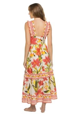 Sarong features a cool toned tropical print and offers a self tie waist.