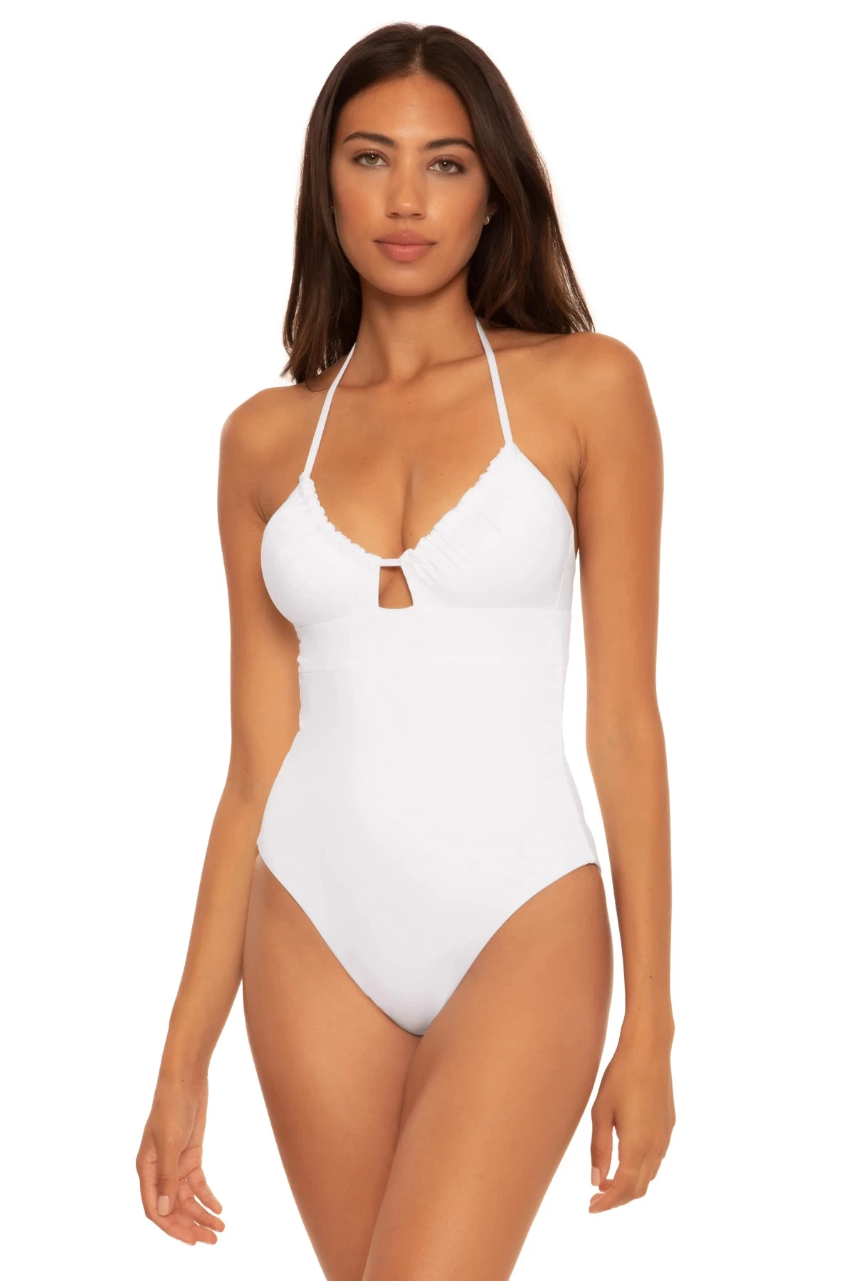 Candice halter one piece swimsuit features removable cups and offers multi-way straps, adjustable back ties and moderate bottom coverage.