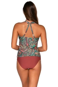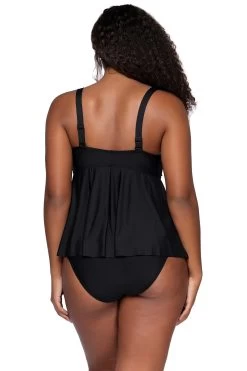 The Cassie Tankini is a flattering dream. With its V neckline and pleating, it is effortlessly feminine. This tankini is slim fitting with ruching on the sides. Cute spaghetti ties on the side offer adjustability. This top has an underwire, removable cups, adjustable straps with a convertible cross-back, and a hidden hook and eye back closure.