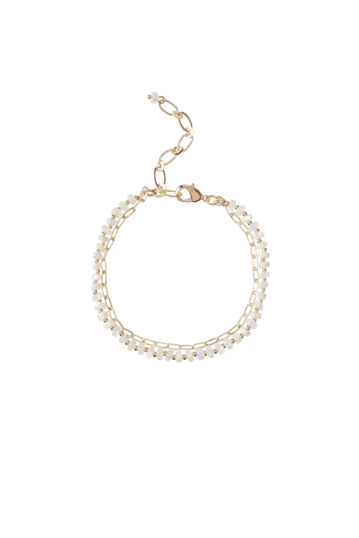 Bracelet features a cable link chain and a white cat’s eye beaded chain.