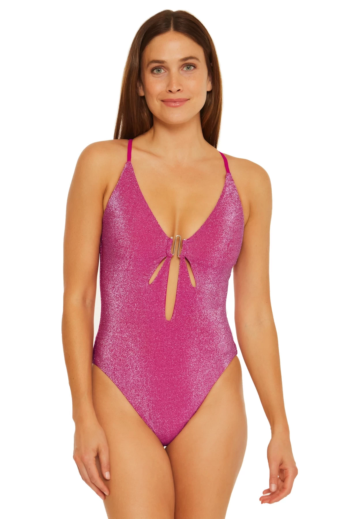 Cosmos maillot one piece swimsuit features a metallic texture and plunging neckline with a M-wire hardware center. Includes removable cups and offers beaded crisscross back ties and moderate bottom coverage.