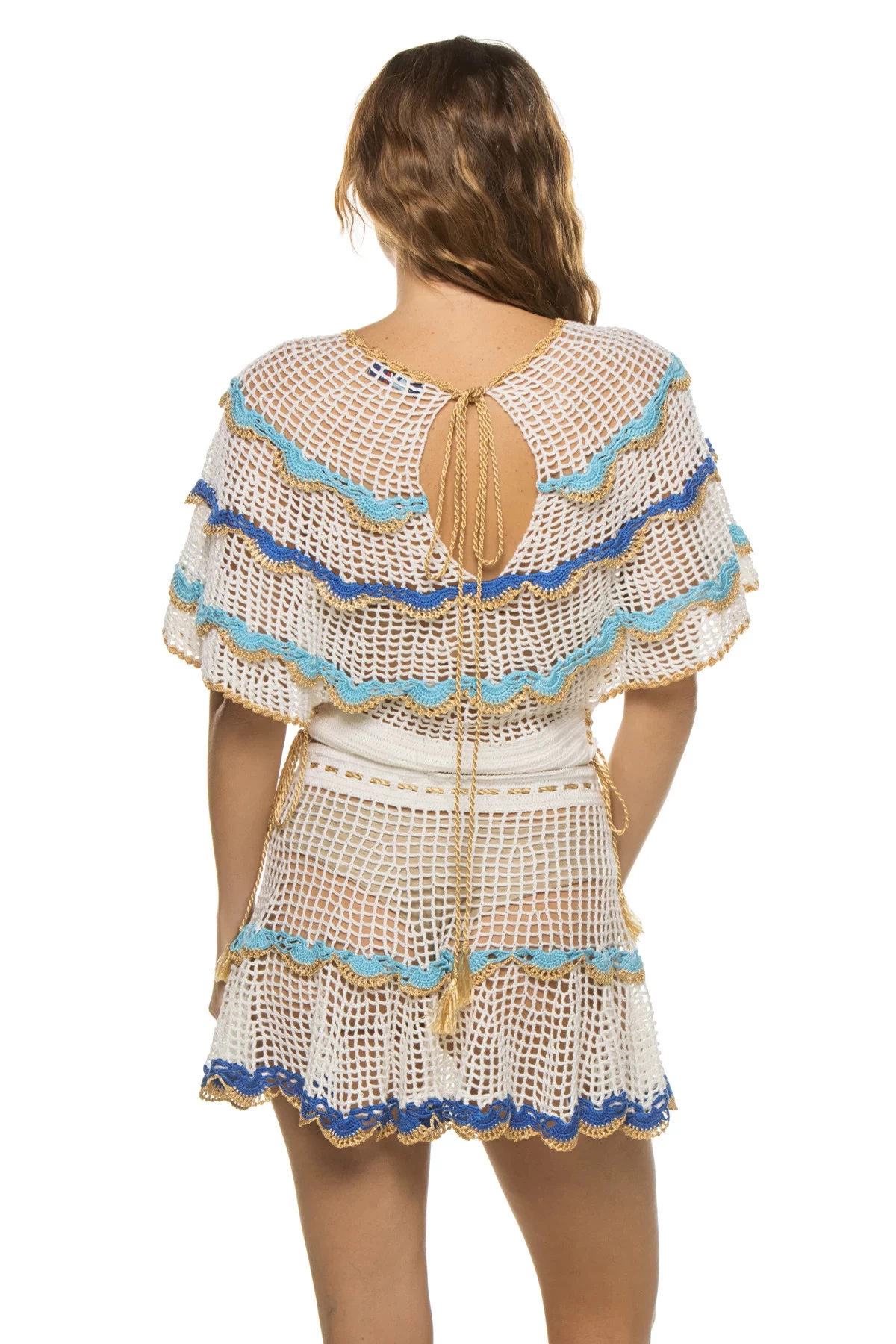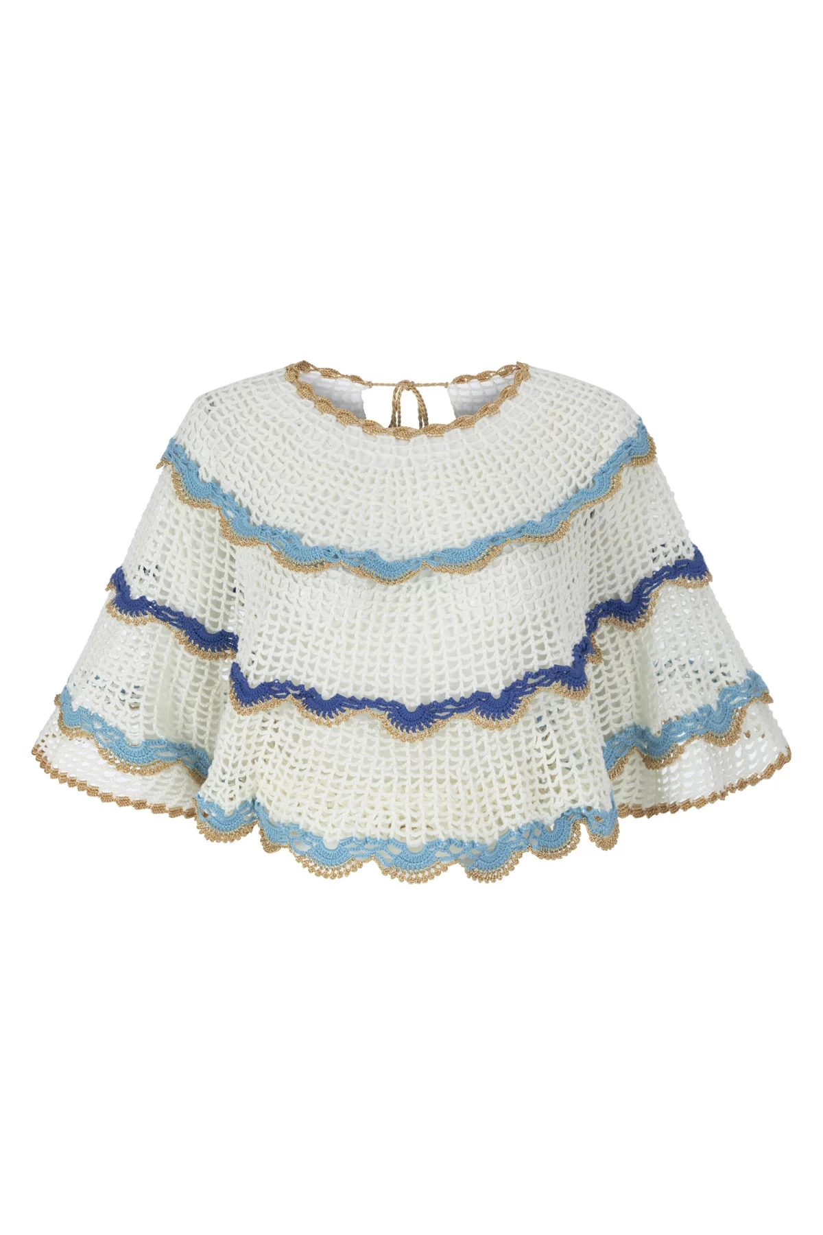 Crop top features a hand woven chevron crochet with scalloped details.