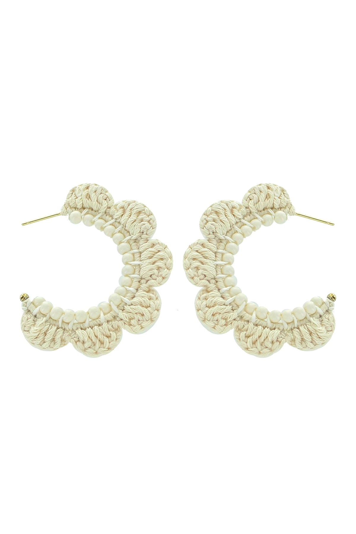 Hoop earrings feature scalloped crochet adorned with howlite beads.