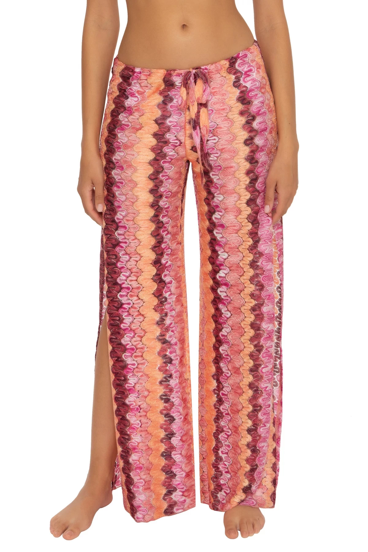 Pants feature a multi colored crochet stripe fabrication with side slits and offers drawstring ties at waist.