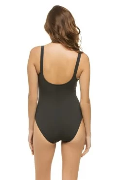 Bandeau one piece swimsuit features a cutout bodice with ring details at hips and bust. Offers adjustable ties around the neck and back.