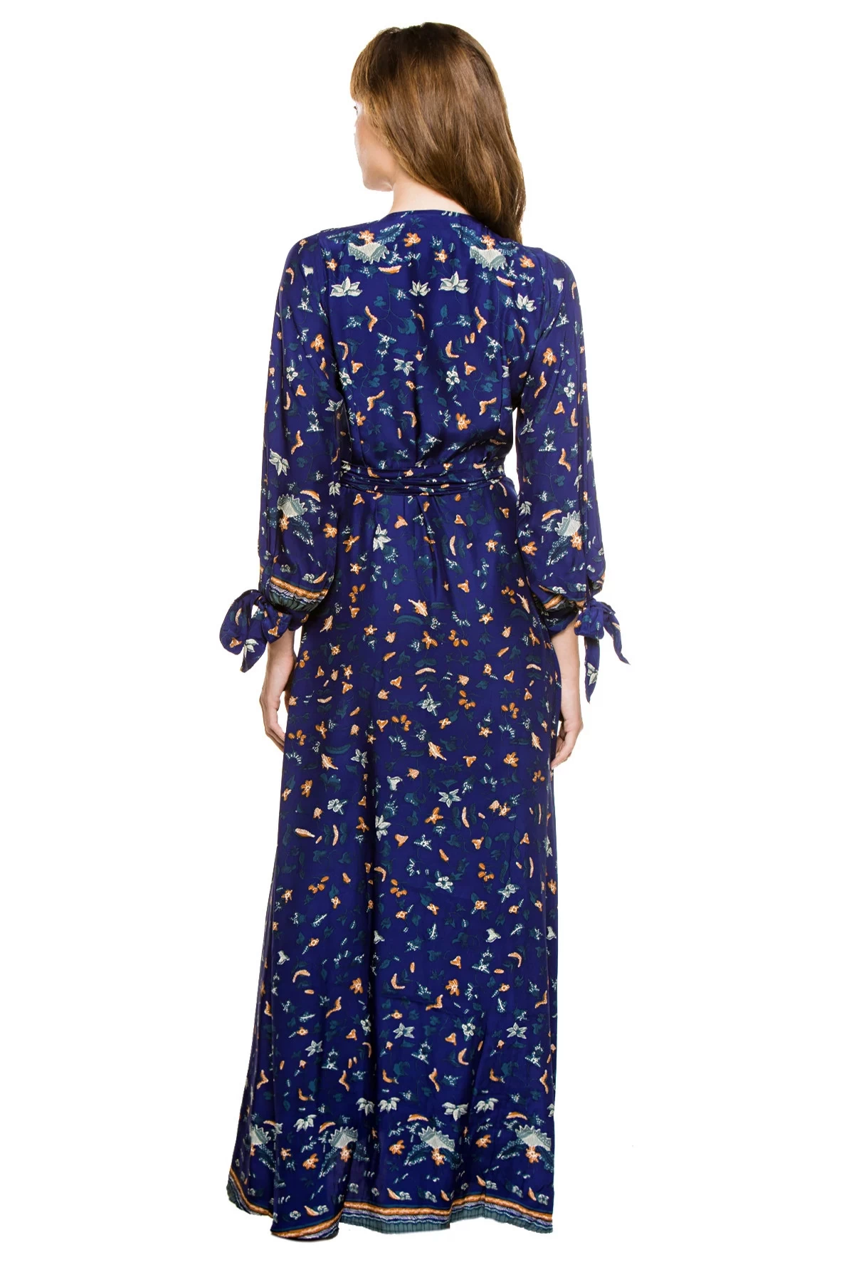 Danika long sleeve maxi dress with wrap bodice and wrap tie closure.