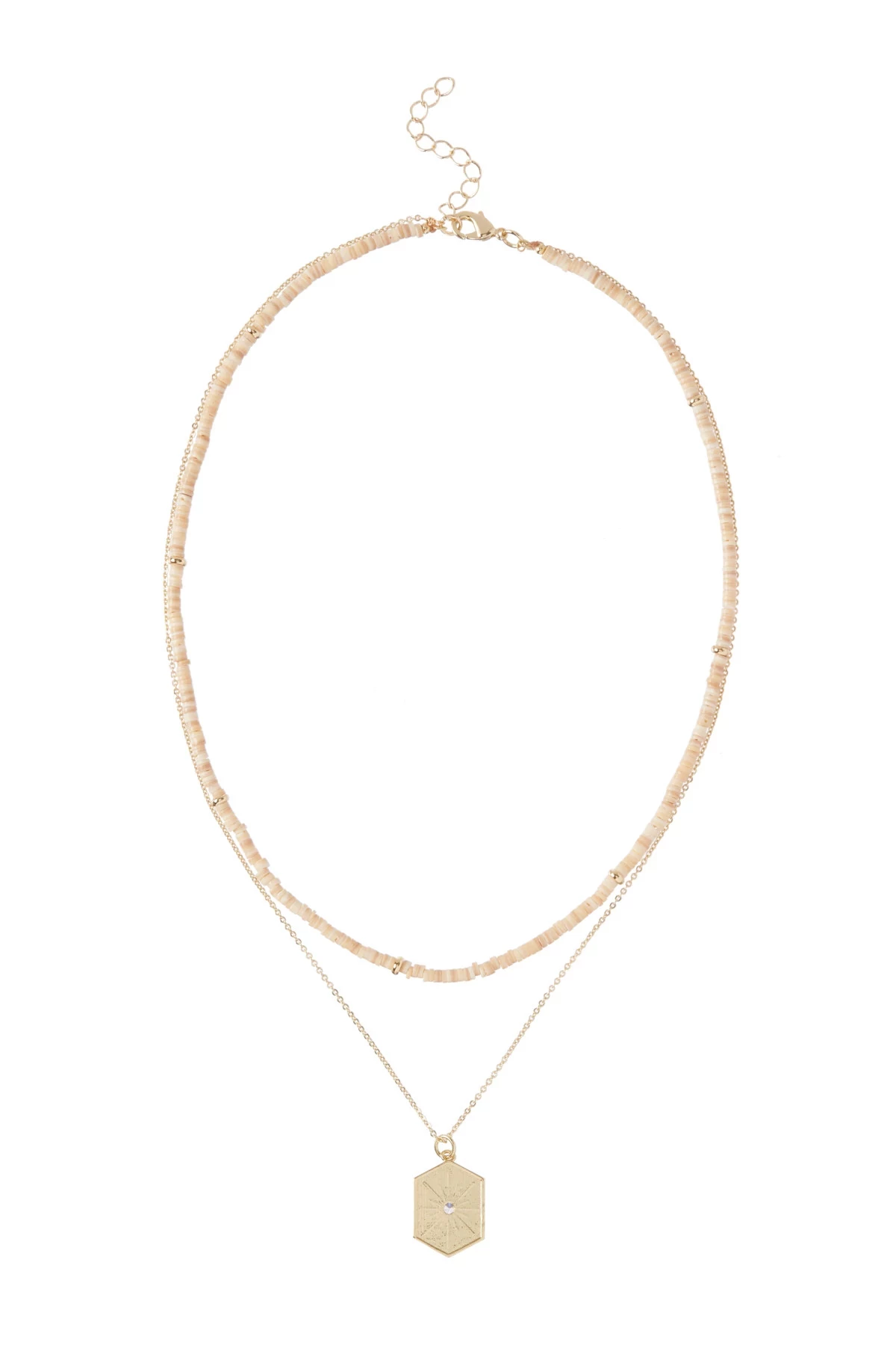 Gold chain necklace features disc beading and a gold plated starburst pendant embellished with a crystal. Lobster clasp closure.