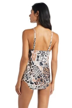 The Elsie Tankini provides sophisticated coverage and comfort. A “V” neckline, wide shoulder straps, and relaxed fit. A cute crossover neckline is a subtle and flattering accent. This tankini has an underwire, j-hook, adjustable straps, removable cups, and a hidden bra hook and eye closure.