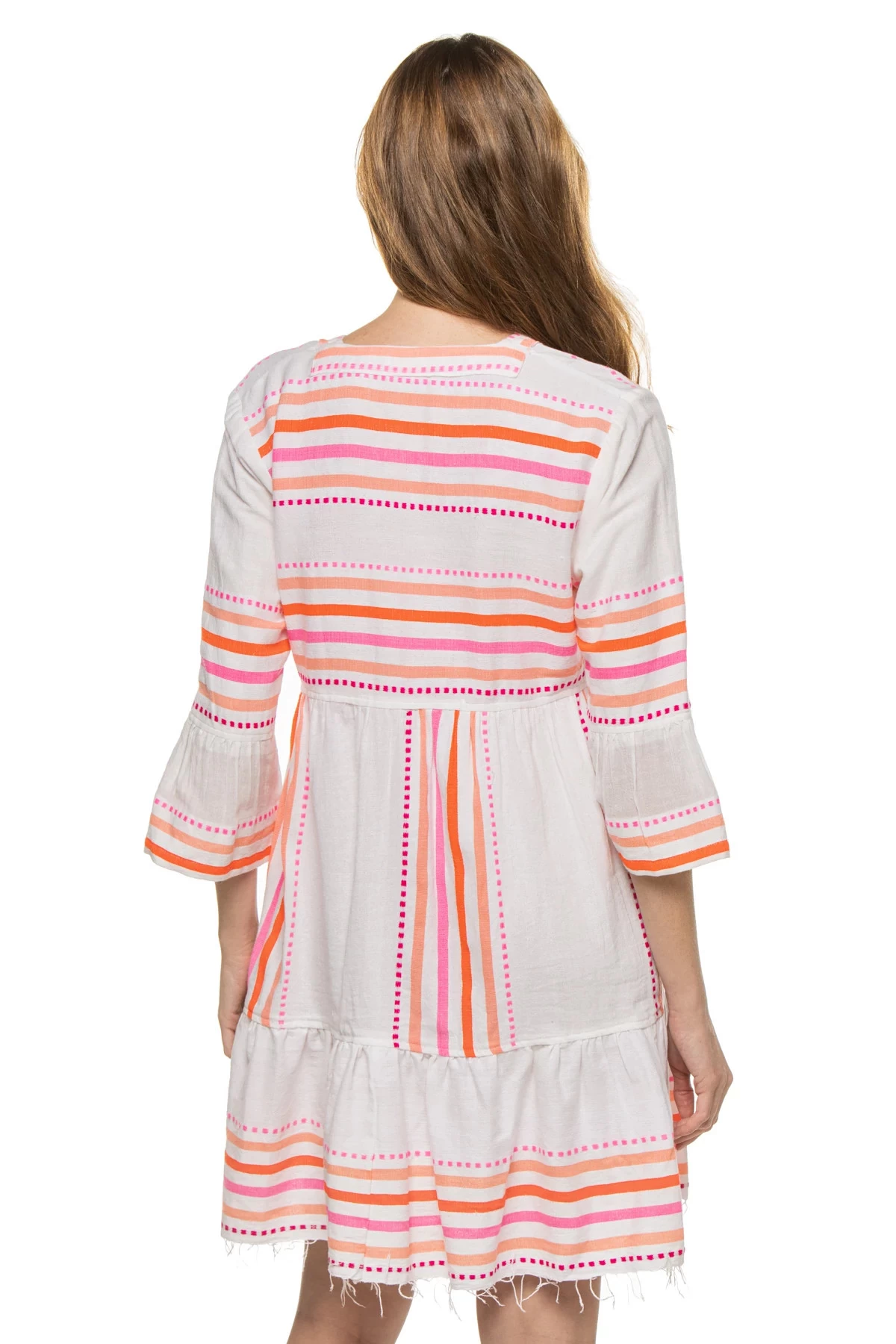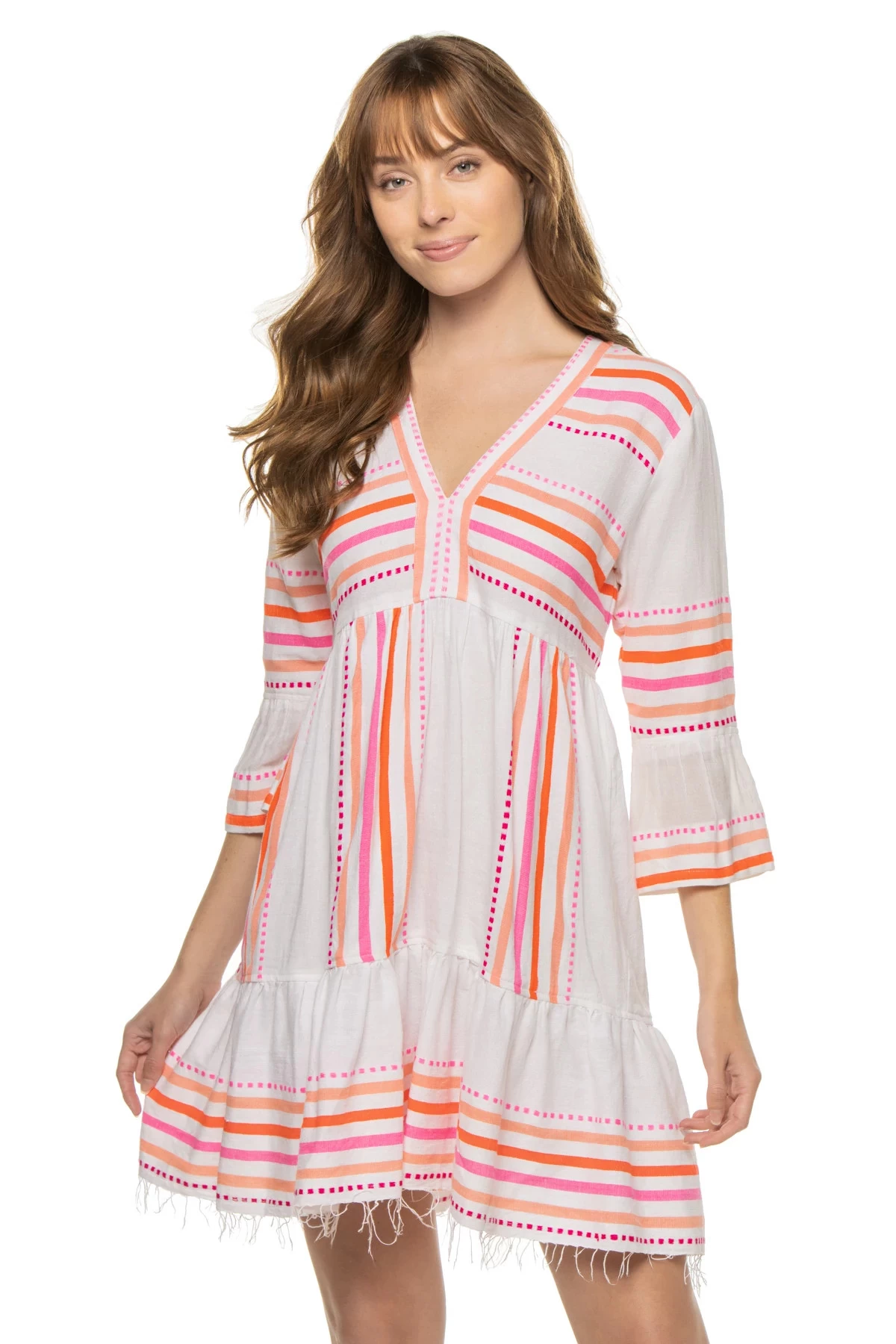 Eshe mini dress features colorful stripes, v-neckline, three-quarter flutter sleeves and a tiered ruffle skirt with a raw fringe trim.