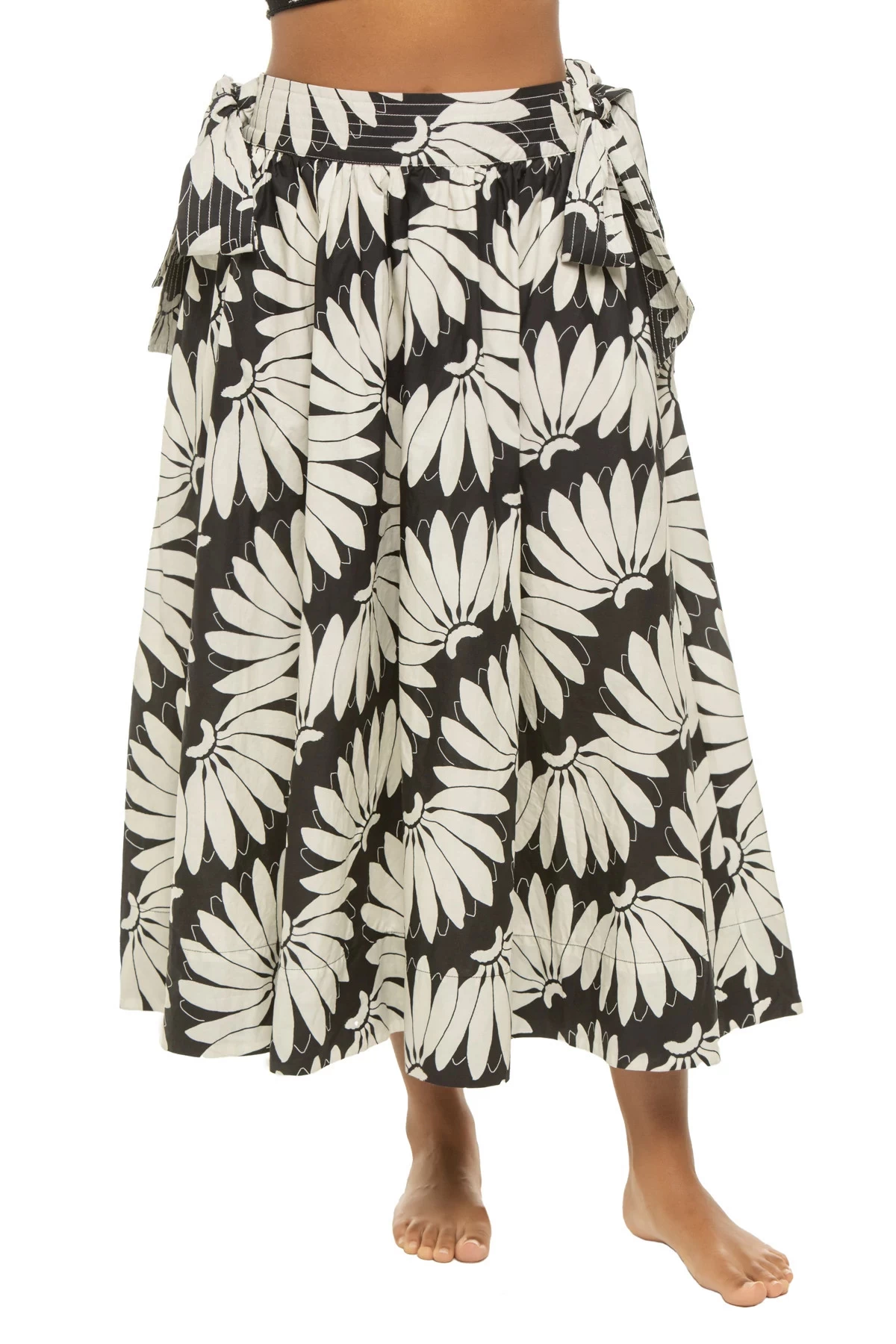 Copabanana midi skirt features a neutral banana print with a wide waistband and tie side details. Offers side zipper closure.