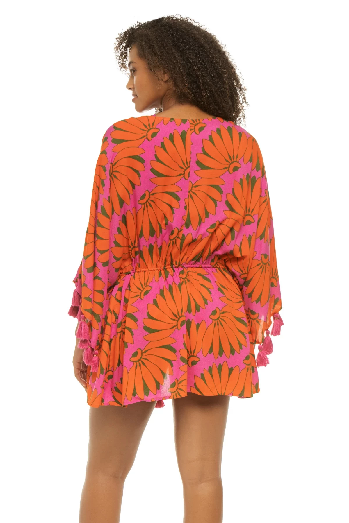 Copacabana Pink kimono features a plunging neckline with drawstring ties at waist and three-quarter tassel sleeves.