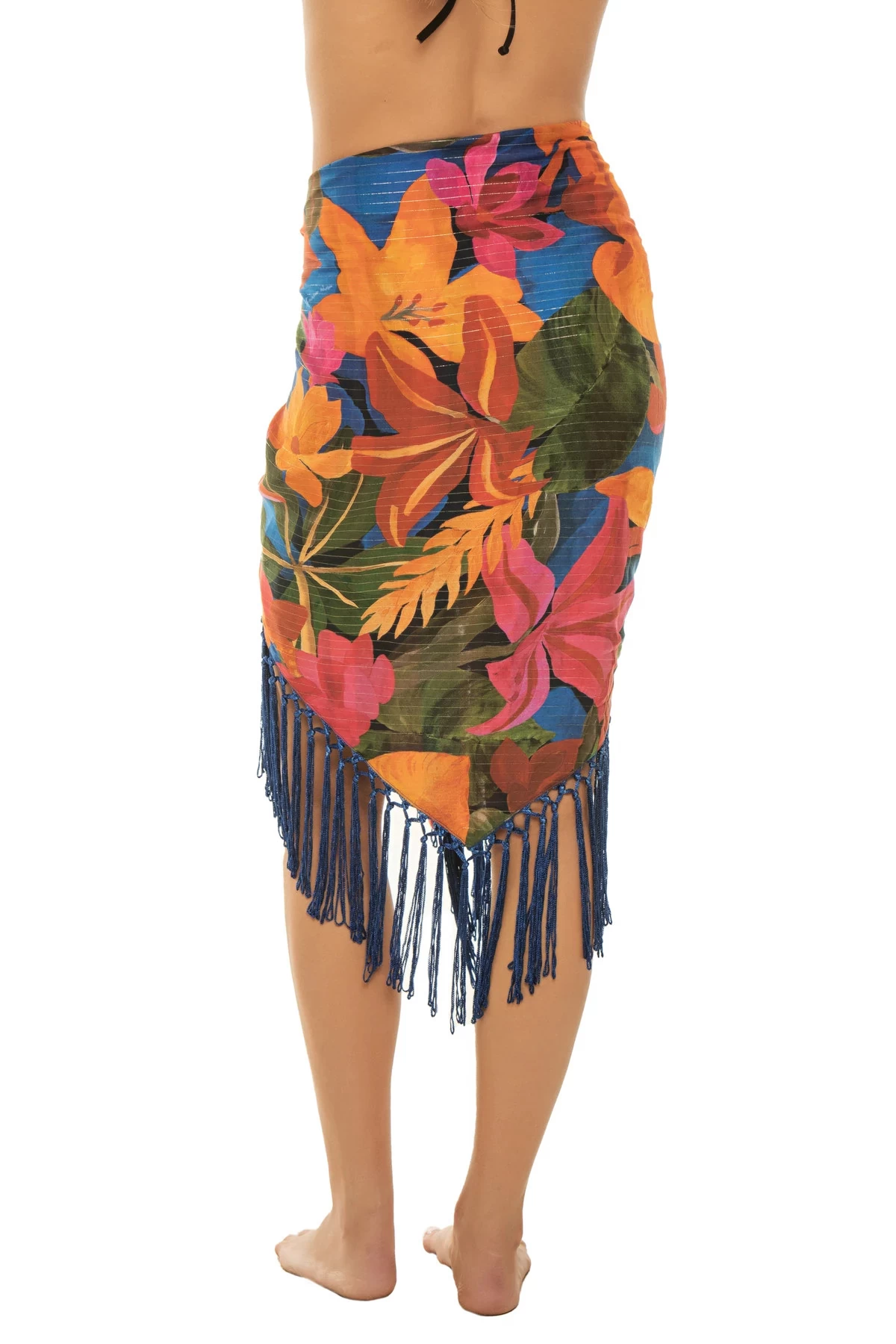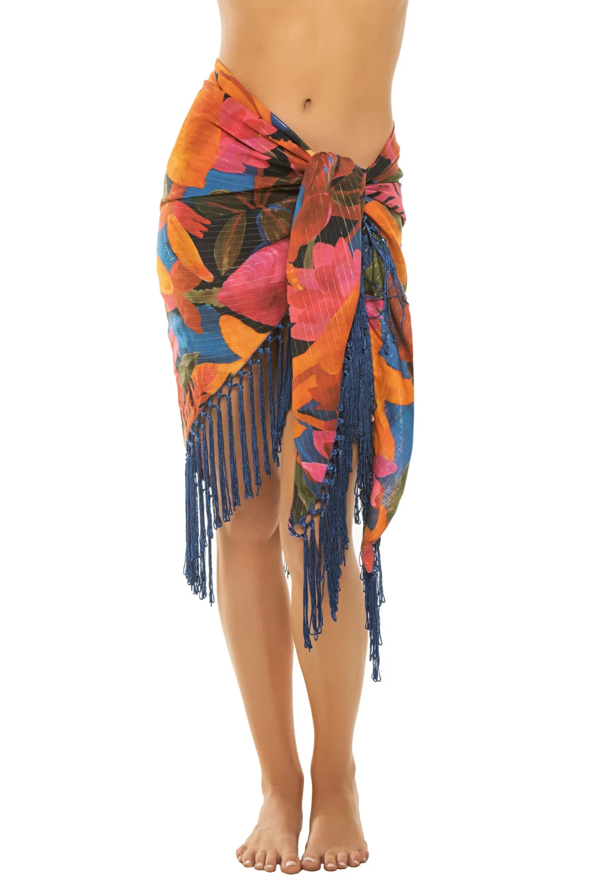 Floral tropical sarong features a fringe hem and offers a self tie waist.