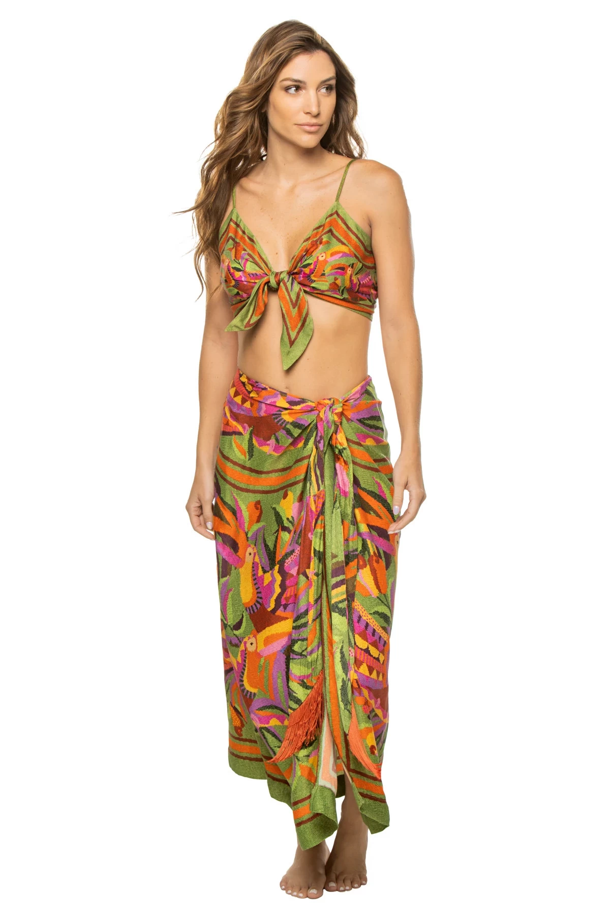 Toucans scarf top features a unique toucan pattern and offers a tie front closure with adjustable straps.