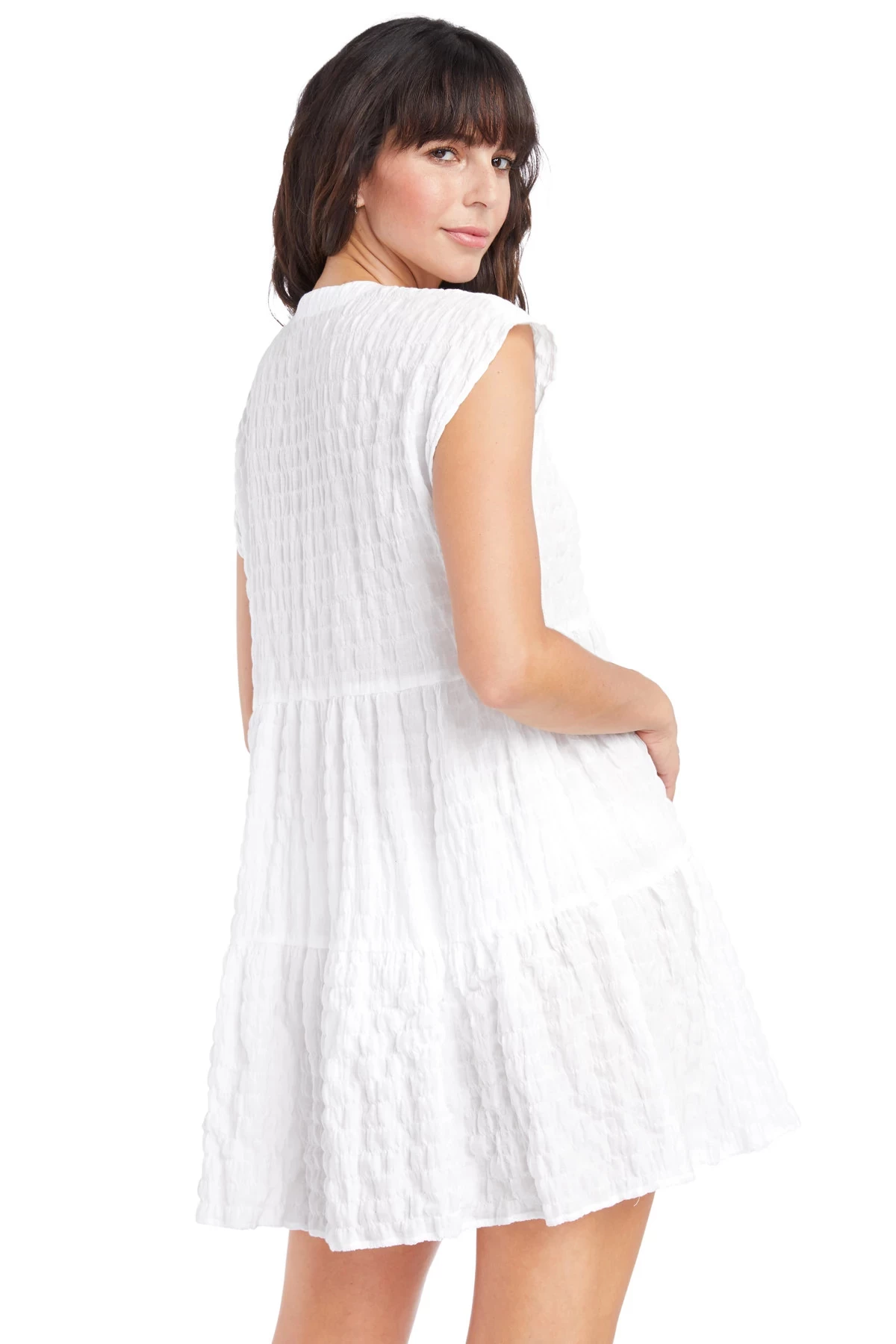 Fiona tiered tunic features a textured fabric and offers cap sleeves and a collared tie neckline.
