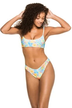 Dallas bralette bikini top features a floral terry fabrication and scoop neck design that offers adjustable shoulder straps and a pull over fit.