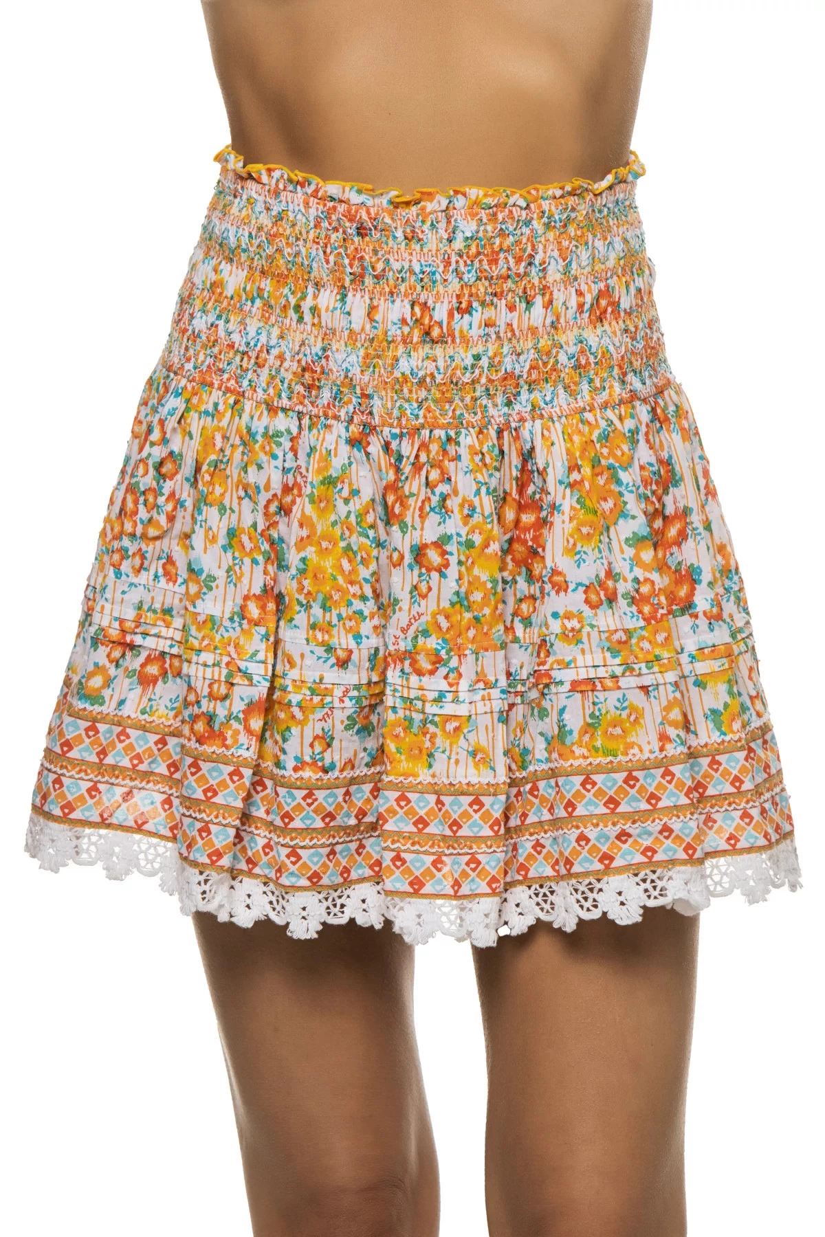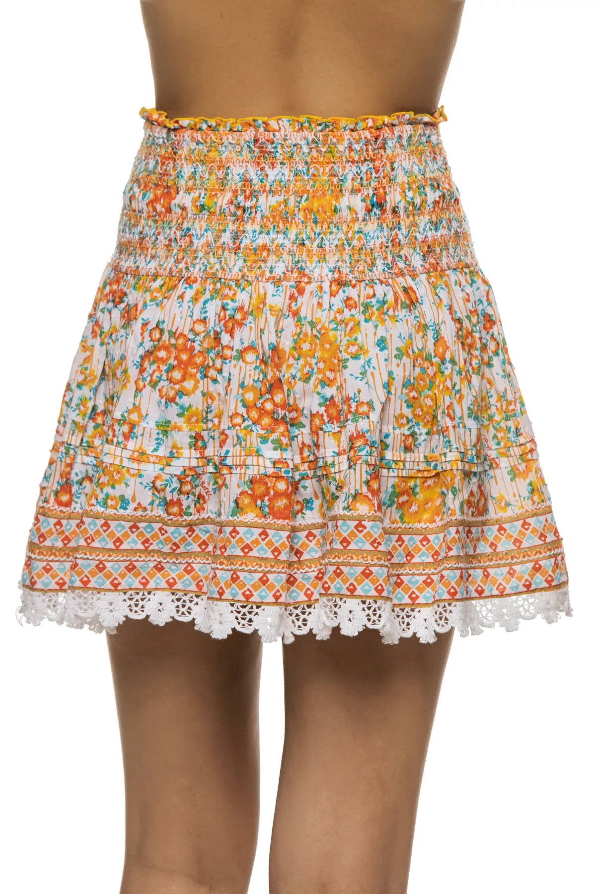 Galia mini skirt features a smocked waistband with a flare skirt adorned with lace trim.