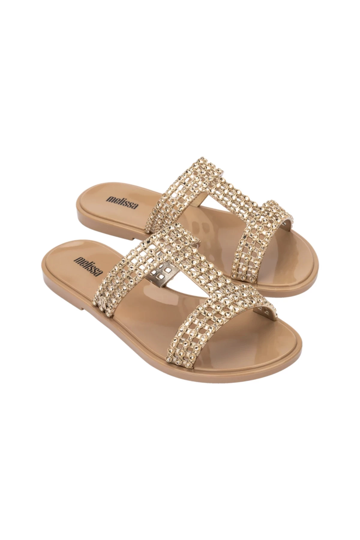 Glowing slide features diamond embellished straps.
