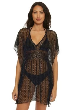Golden metallic tunic features an intricate textured design with metallic accents and offers flutter sleeves with side slits and a plunging neckline.