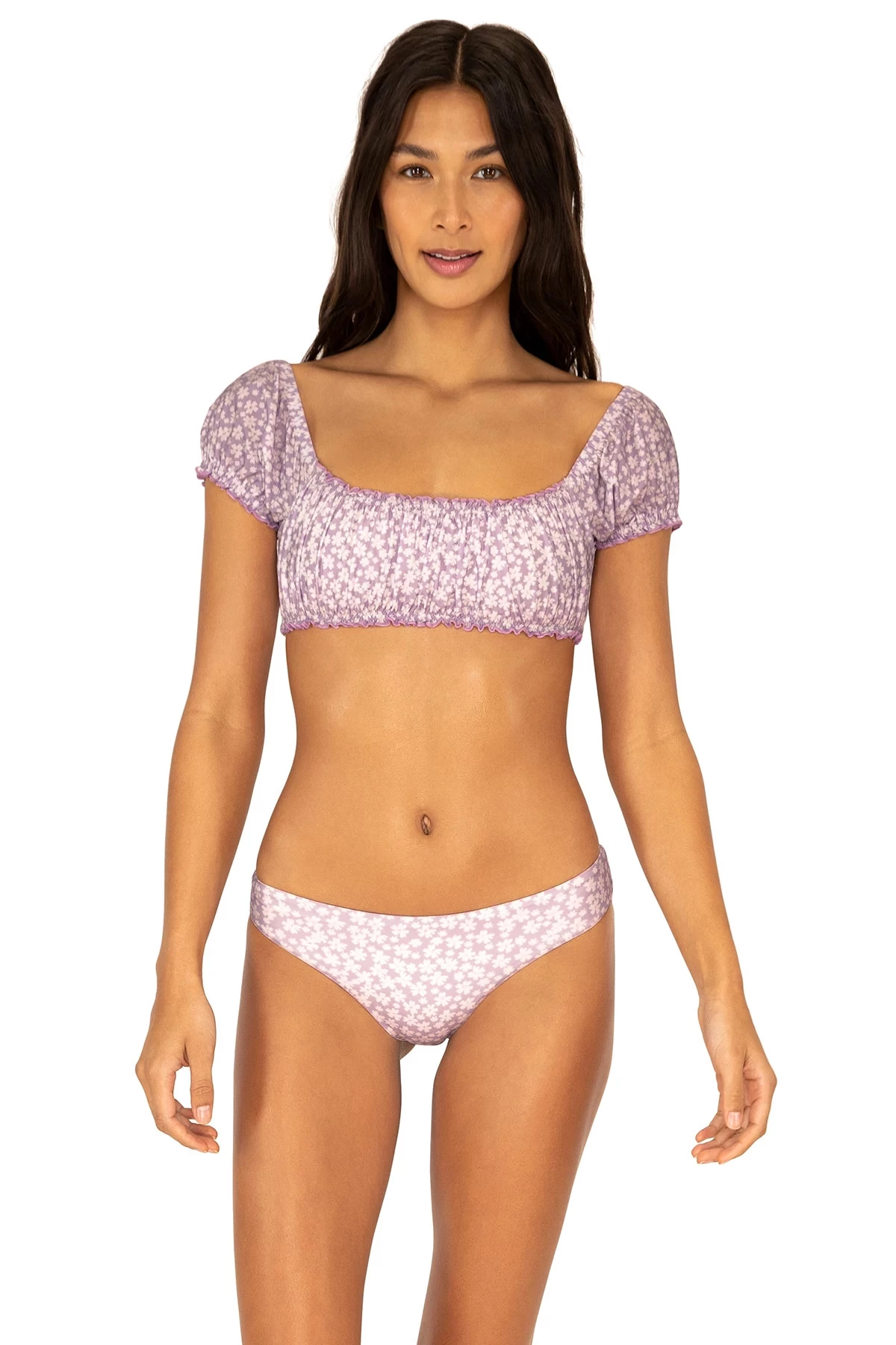 Harper bralette bikini top features shirring details, ruffle trim, and short sleeves with ties at the back.