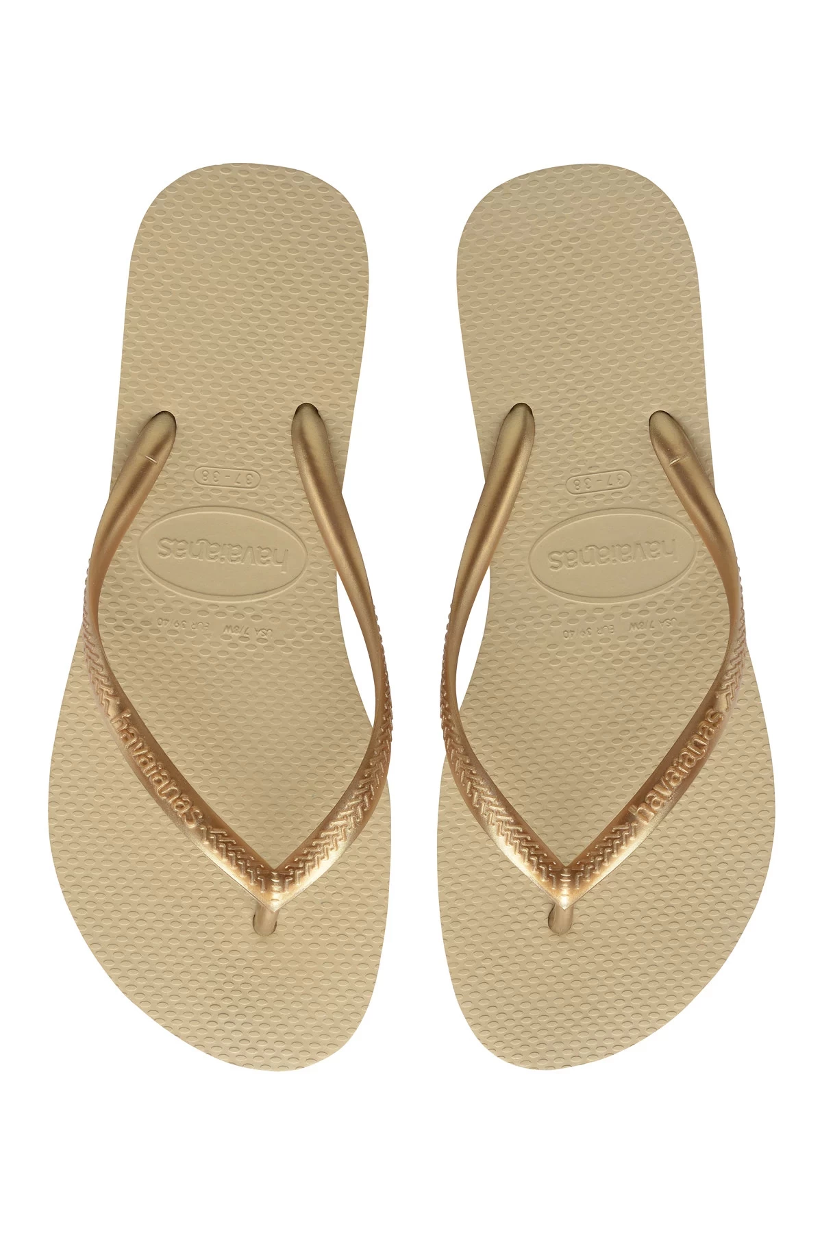 Slim flip flops with metallic logo strap and rubber soles.