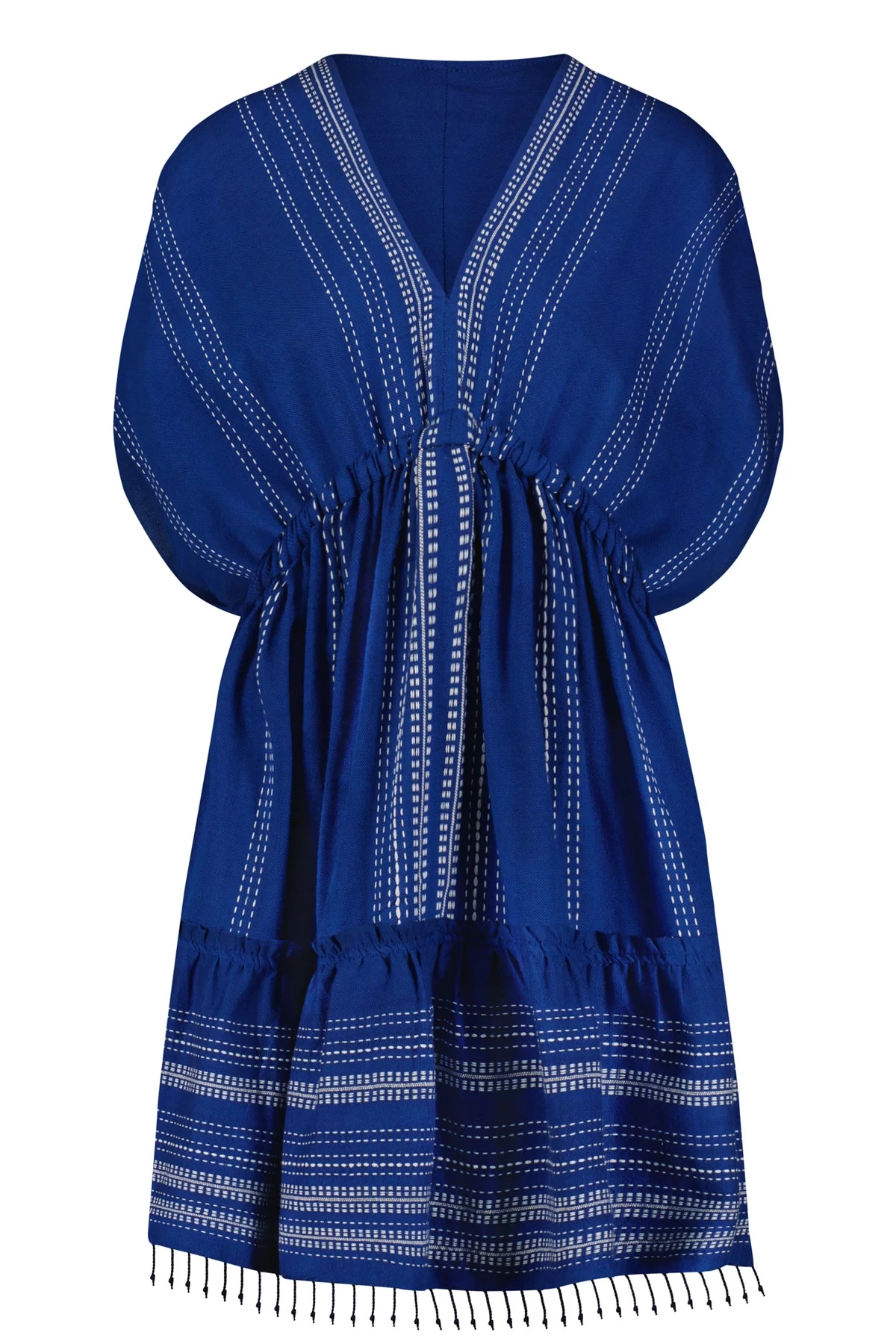 Inku mini dress features textured white dots playfully placed to fade-in and fade-out on the deep ocean blue silhouette by the most skilled artisans. Offers a deep v-neckline, dolman sleeves, ruffled hem and an elastic waist.