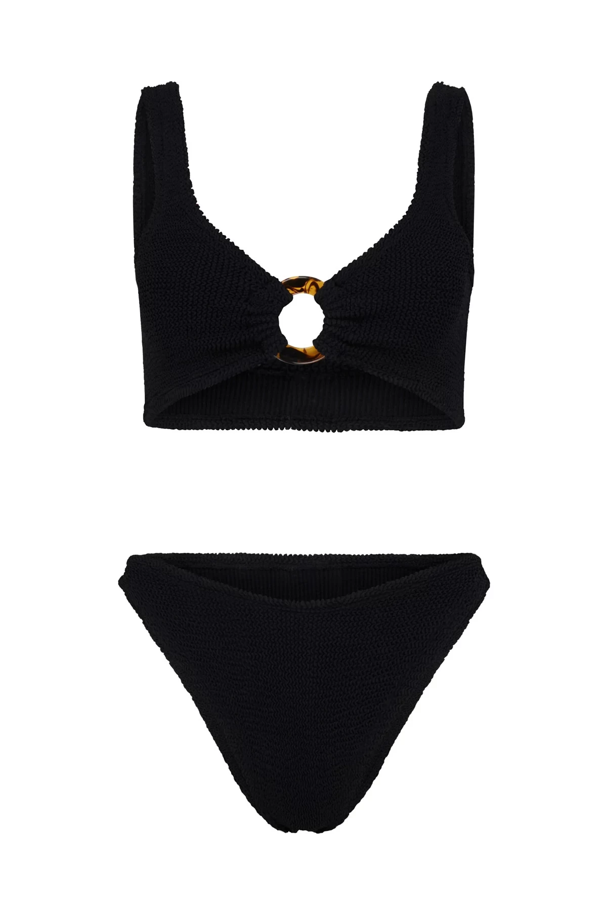 Julia two piece bikini set features a signature crinkle-stretch fabrication with a center tortoise shell detail and a high leg hipster bikini bottom.