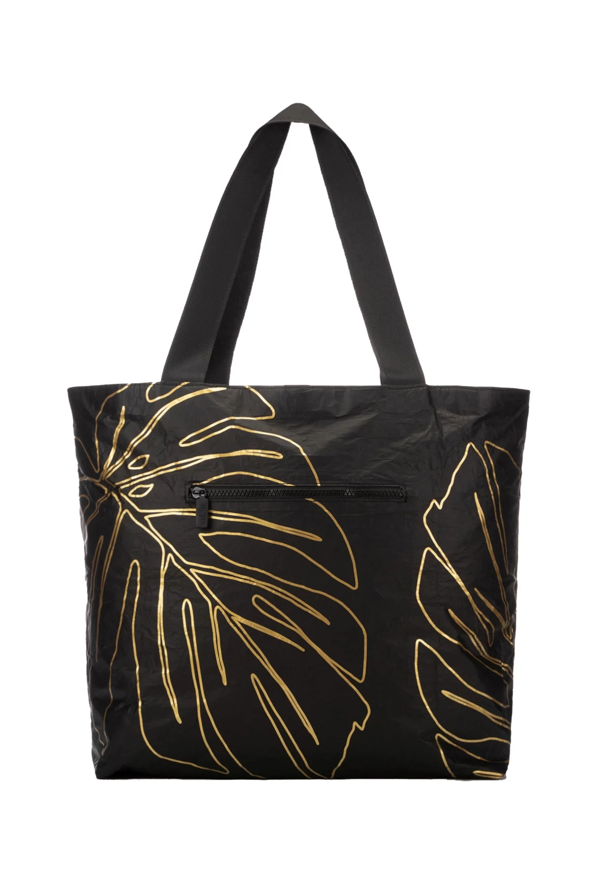 Lanai tote bag features a metallic palm print with a zipper closure and zipper pockets.