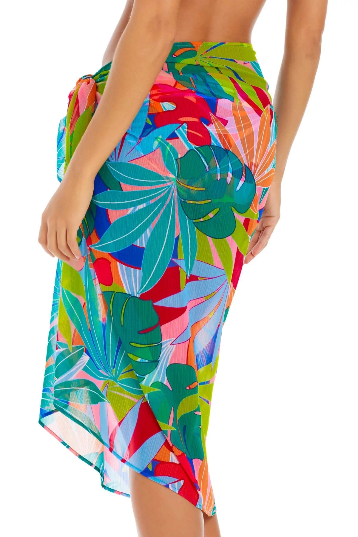 Sarong features a vibrant tropical print and offers an adjustable side tie.