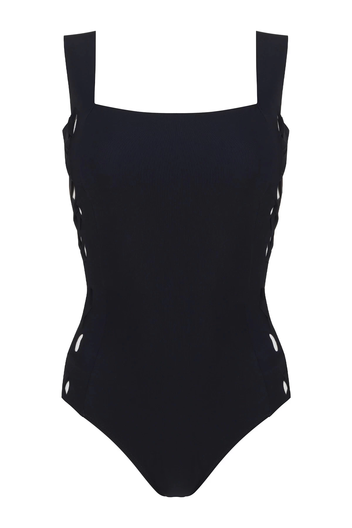 Lois over the shoulder one piece swimsuit features bonded bands on the sides with raw cut out details and permanent ribbon laces. Offers a square neckline with moderate coverage.