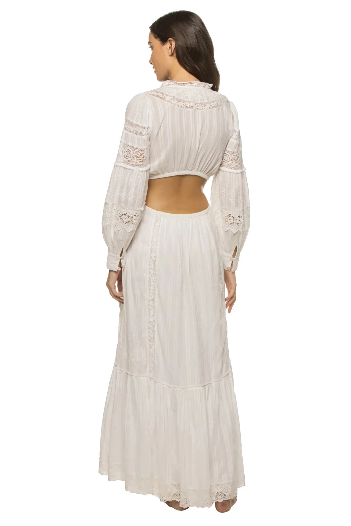 Aneesha maxi dress features cut-out lace details with a tiered skirt and leg slit. Offers a v-neckline and long sleeves.