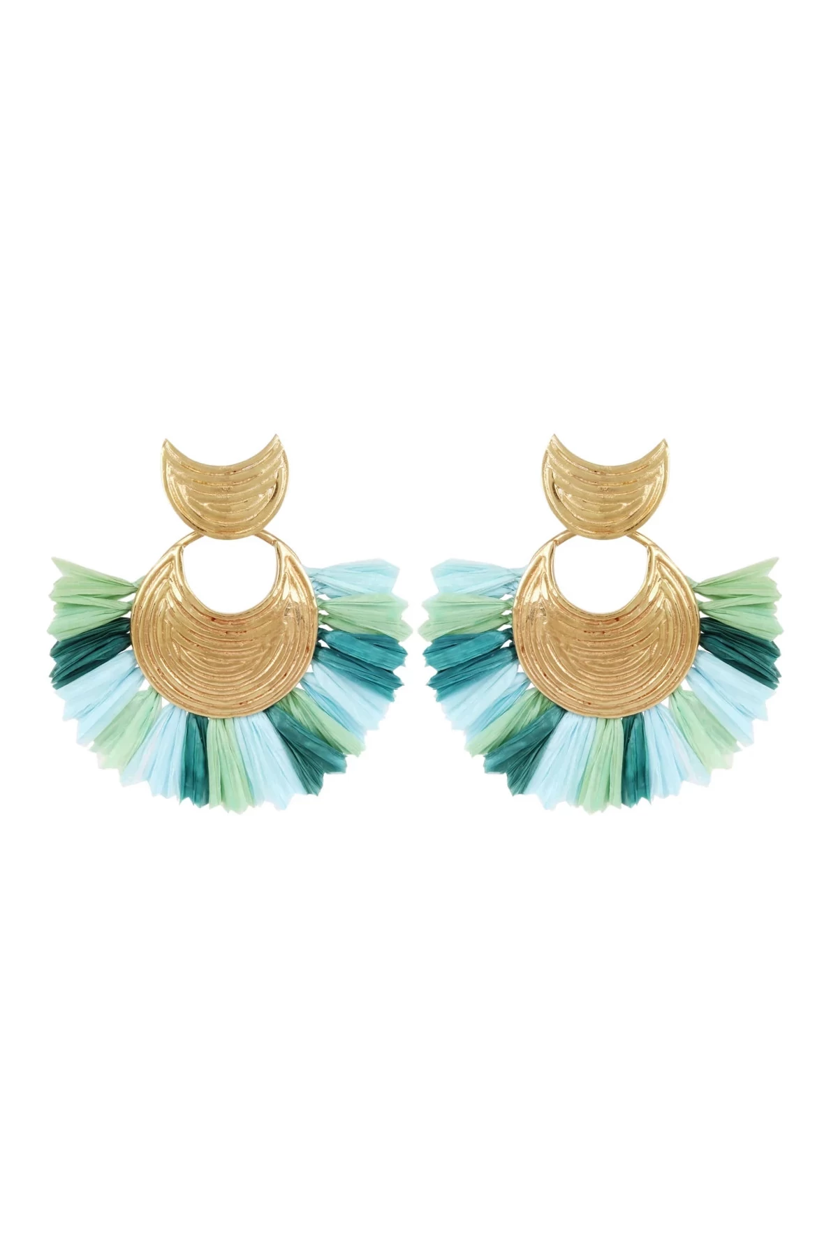 Luna wave earrings feature 24k gold plating finely worked in a spiral and embellished with colored raffia.
