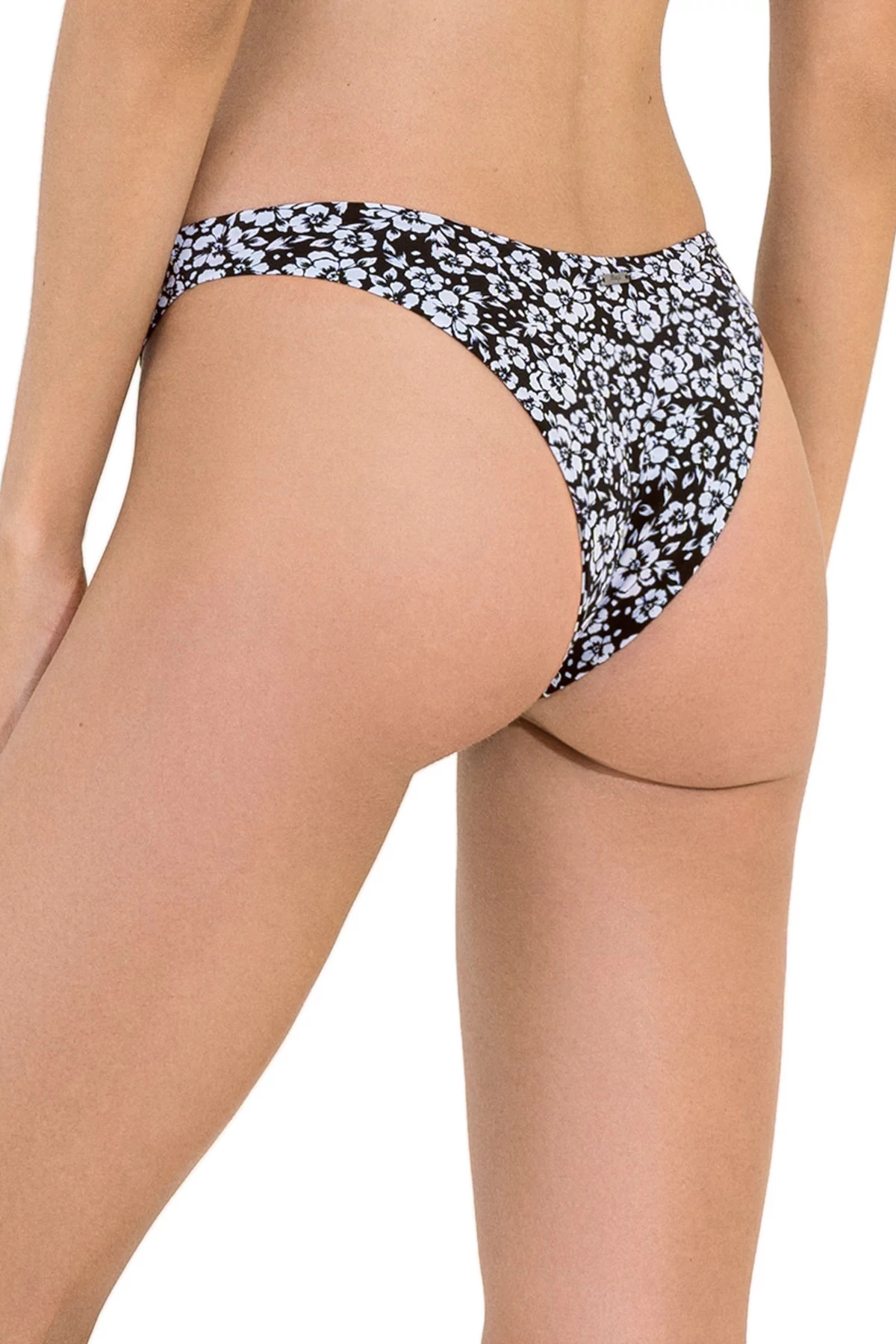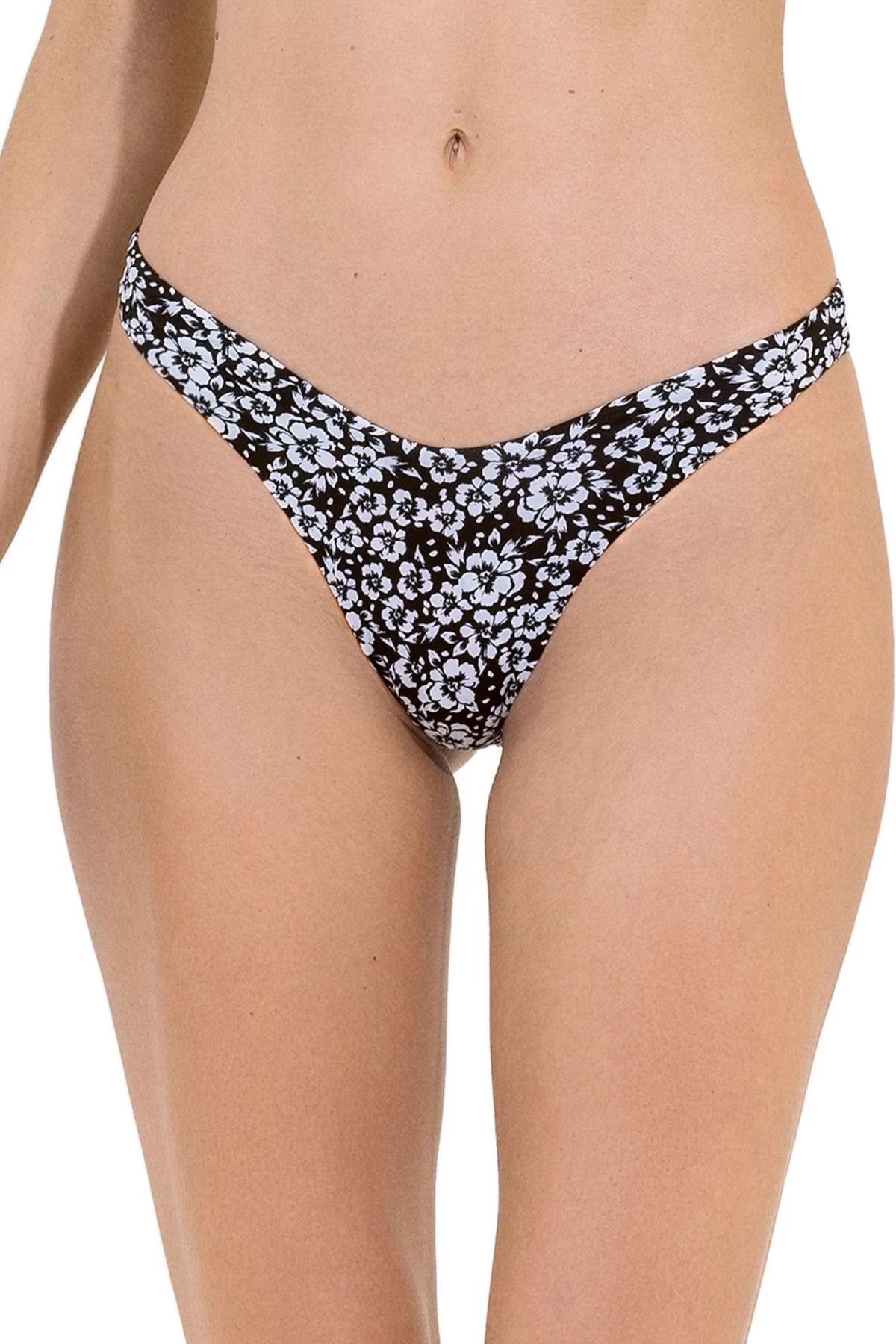 Splendour brazilian bikini bottom features a floral print with a v-cut waistband and offers a high leg cut and minimal coverage.