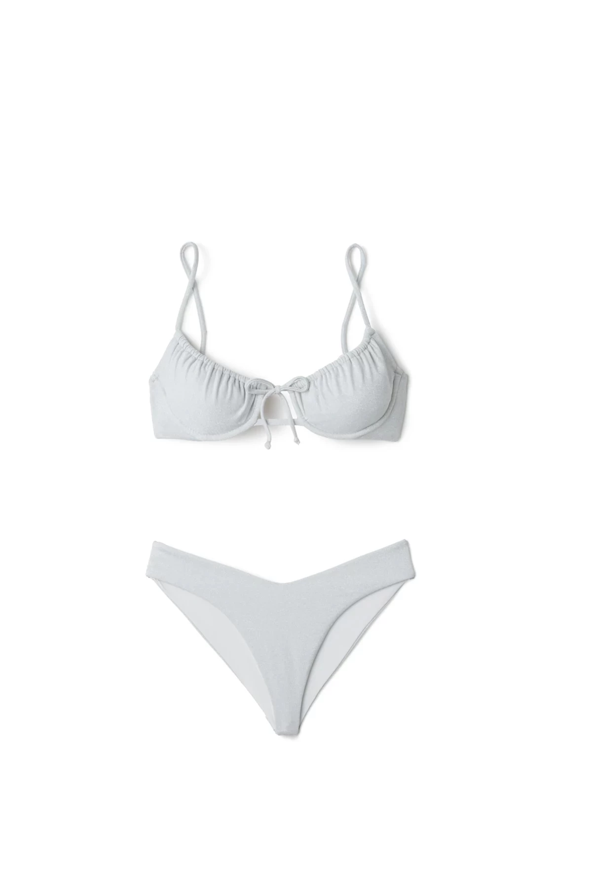 Malibu brazilian bikini bottom features a metallic fabric and offers a high leg cut, v front and back, with minimal bottom coverage.