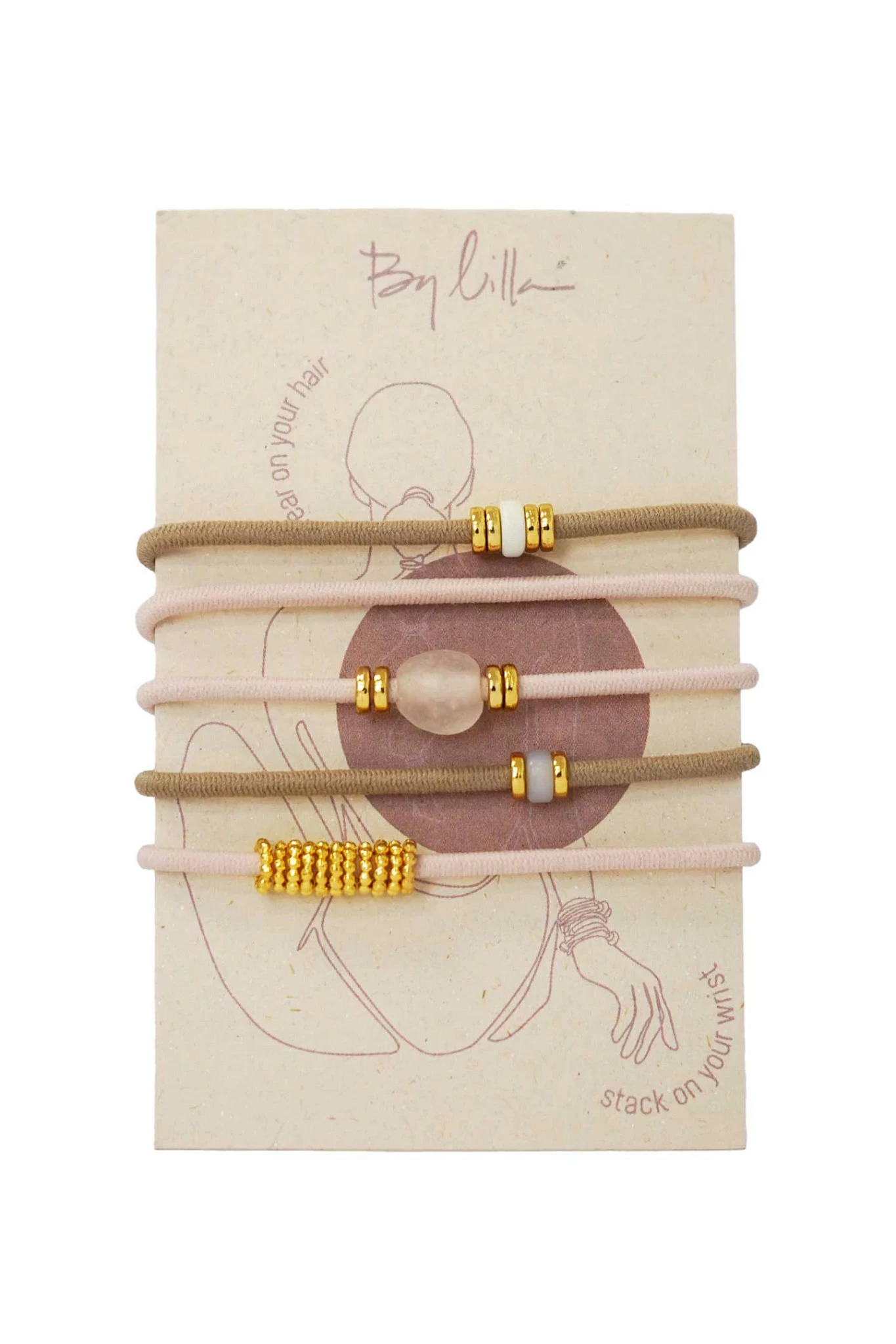 Mini stacks elastic hair tie bracelets. Wear them as bracelets and when you need a hair tie, just grab one from your stack.