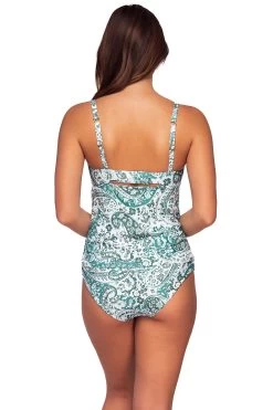 Monaco halter tankini top features a v-neckline with solid ring connectors and offers adjustable neck ties and removable cups.