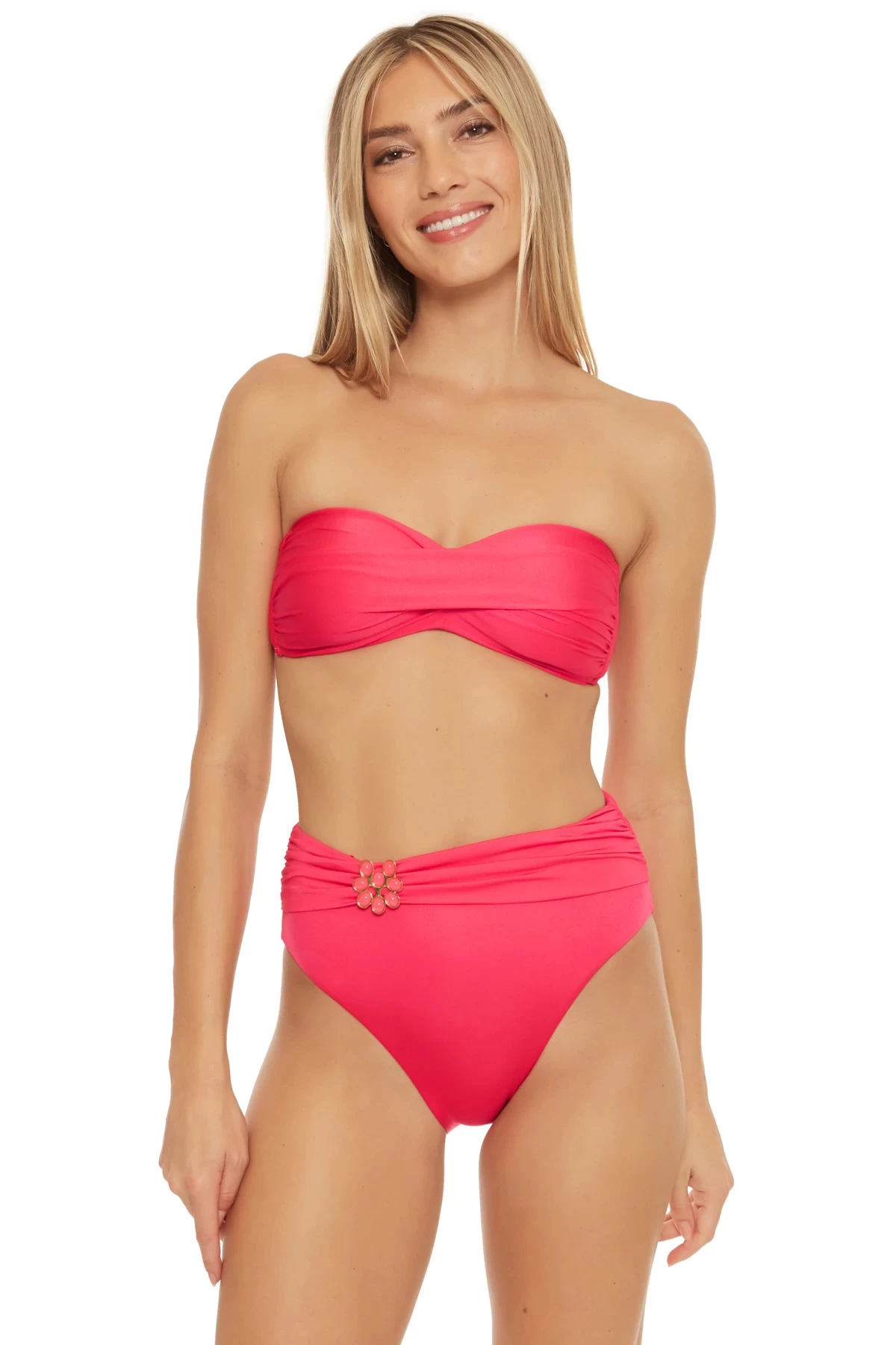 Monaco bandeau bikini top features a twisted bra and offers a detachable halter strap and a hook back closure.
