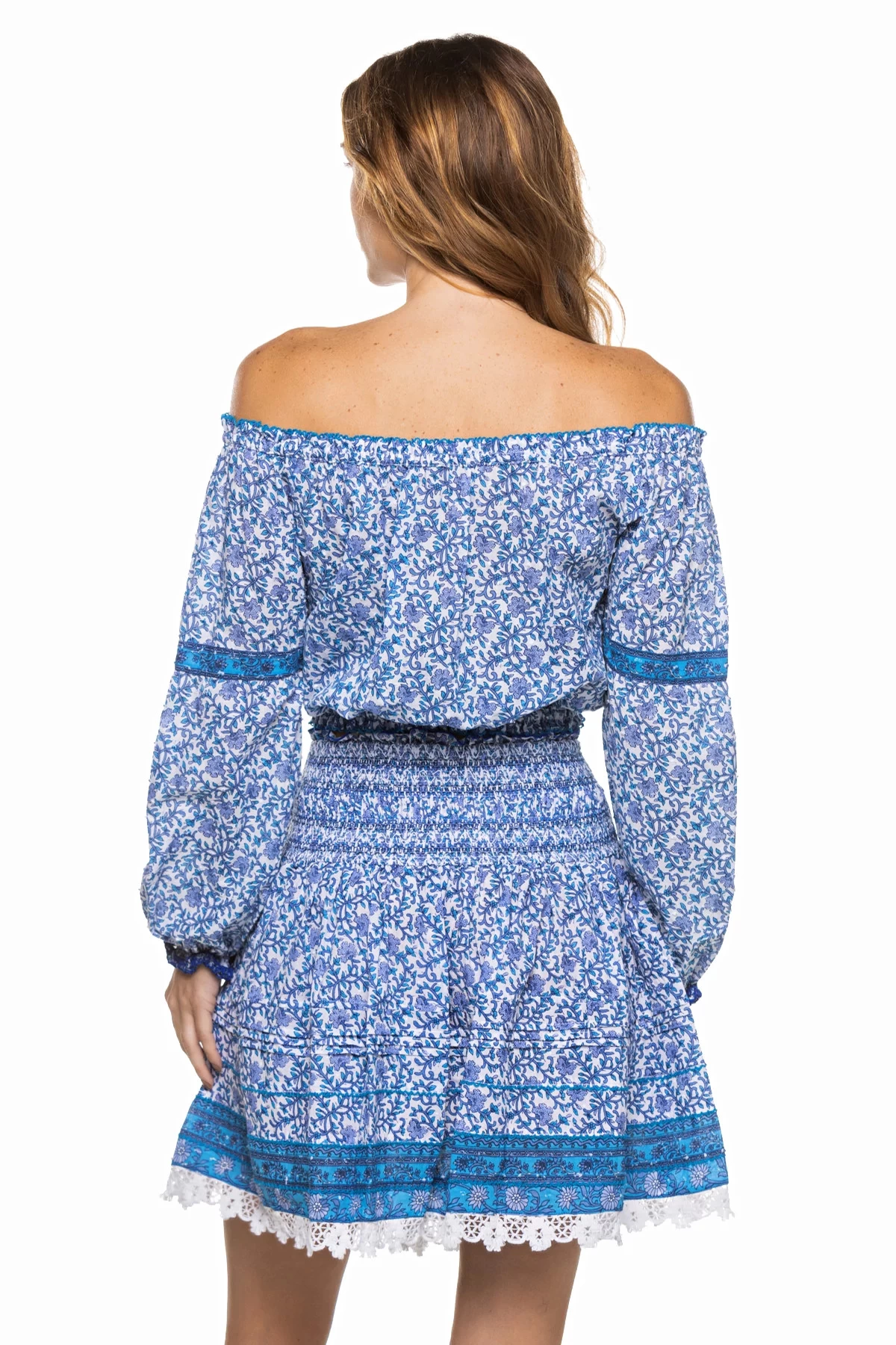 Nana off shoulder blouse features a floral print with embroidered trim and an elastic neckline and waist.