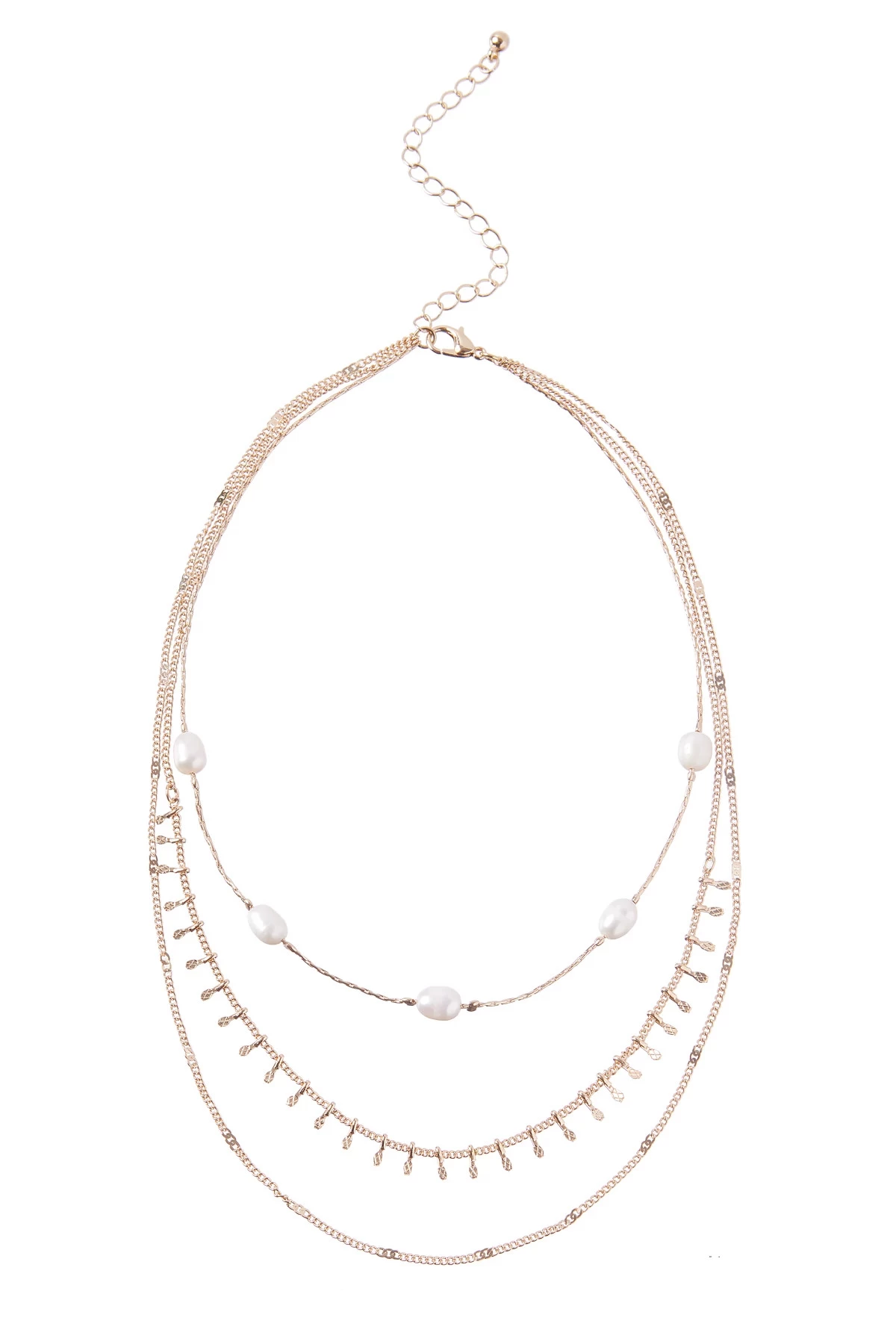 Necklace features layered chains with pearl accents.