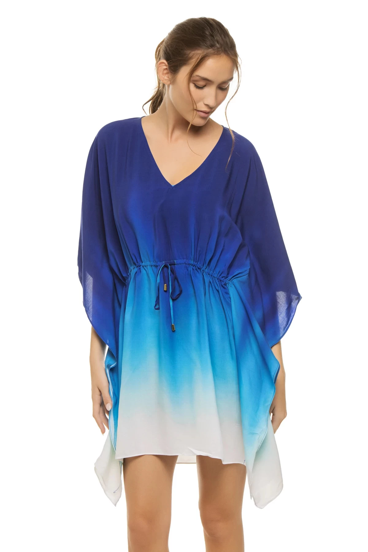 Ombre tunic features a v-neckline with wide flowy sleeves and a drawstring waist.