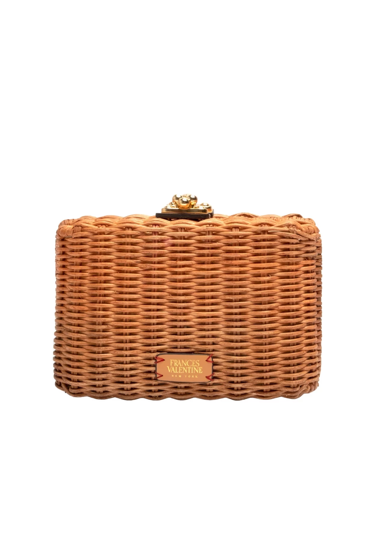 Paige clutch features a wicker body with a spherical metal clasp closure and chain strap.