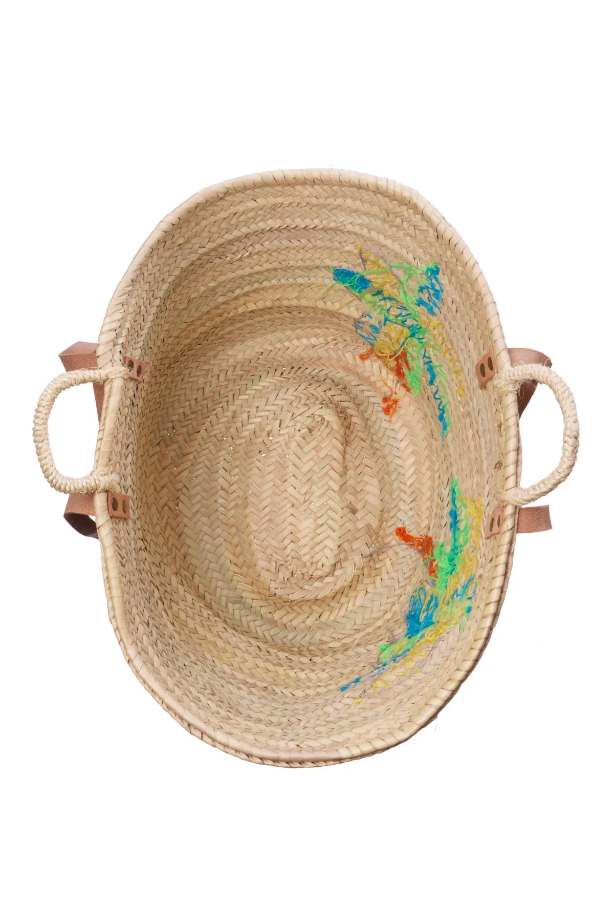 Palm tote features a woven palm leaf fabrication with leather drop handles and crochet palm trees.