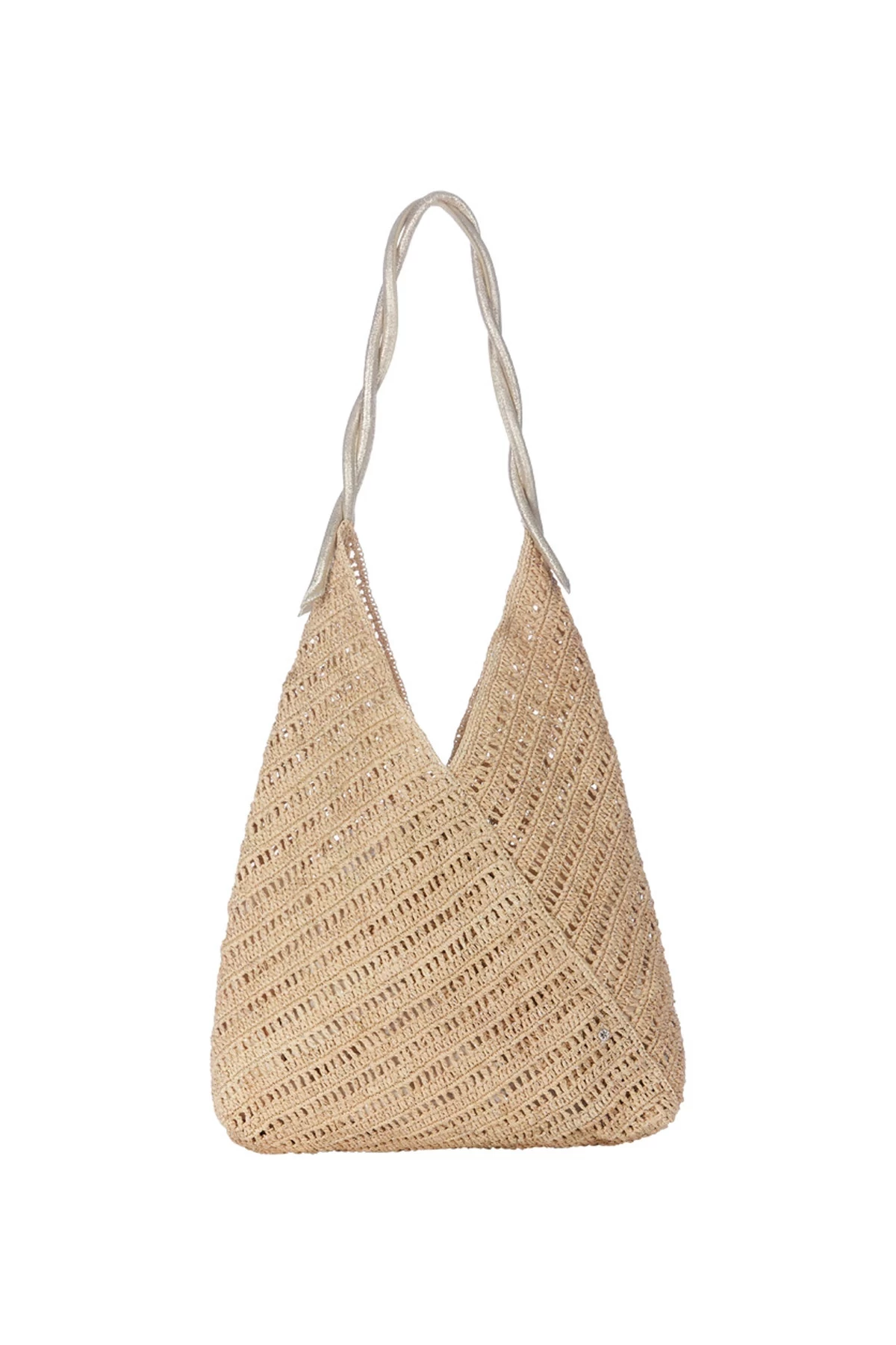 Panama lux tote features a crochet raffia with metallic threading and leather trim.