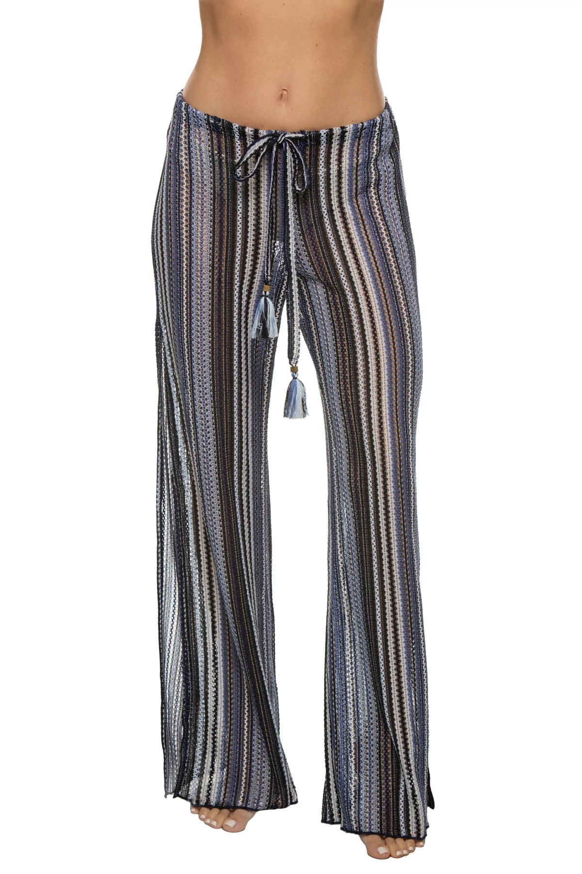 Pierside pants feature an open weave crochet body with side slits and offers an adjustable waist tie.