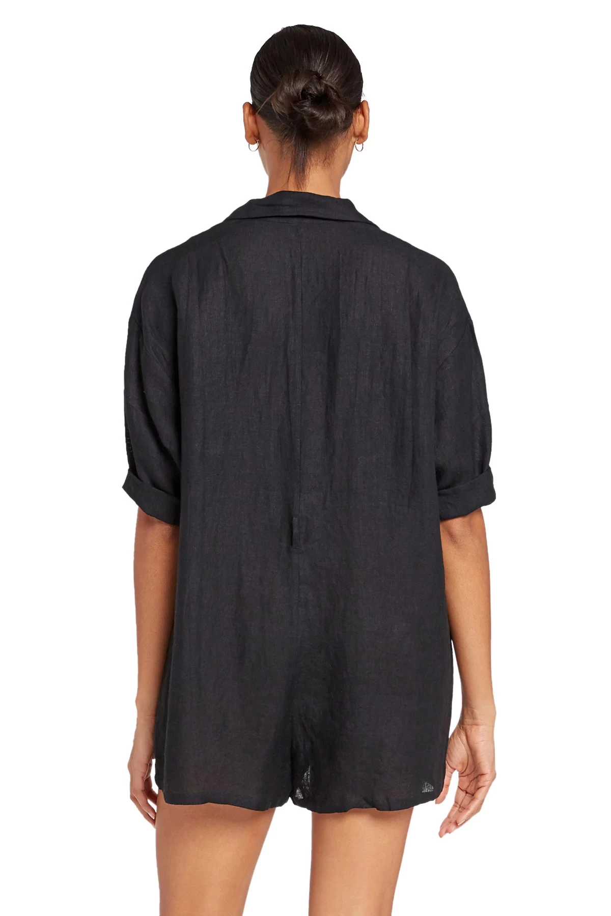 Playa romper offers an oversized fit shell buttons and a removable self tie belt.