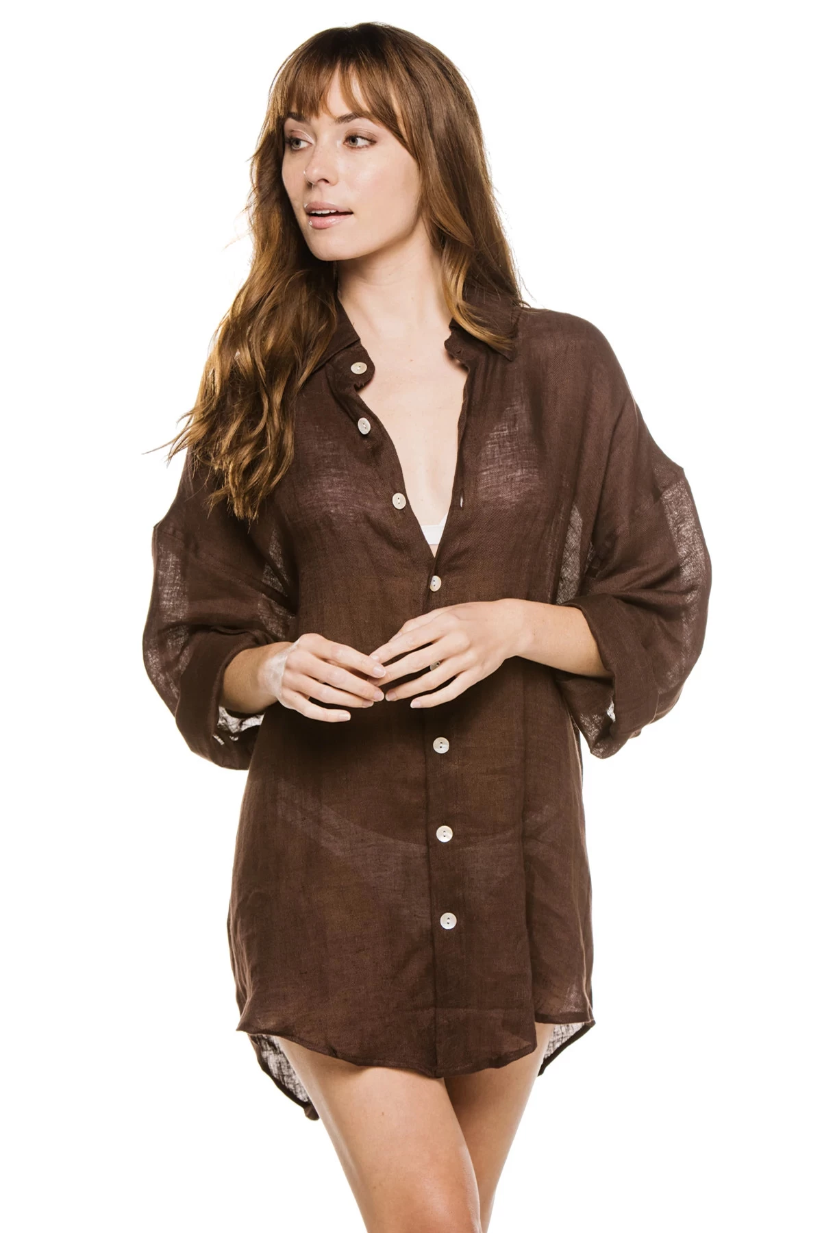 Floaty linen shirt dress – a chic, easy essential with drop sleeve, natural shell buttons. Perfect for any destination, on or off the beach.